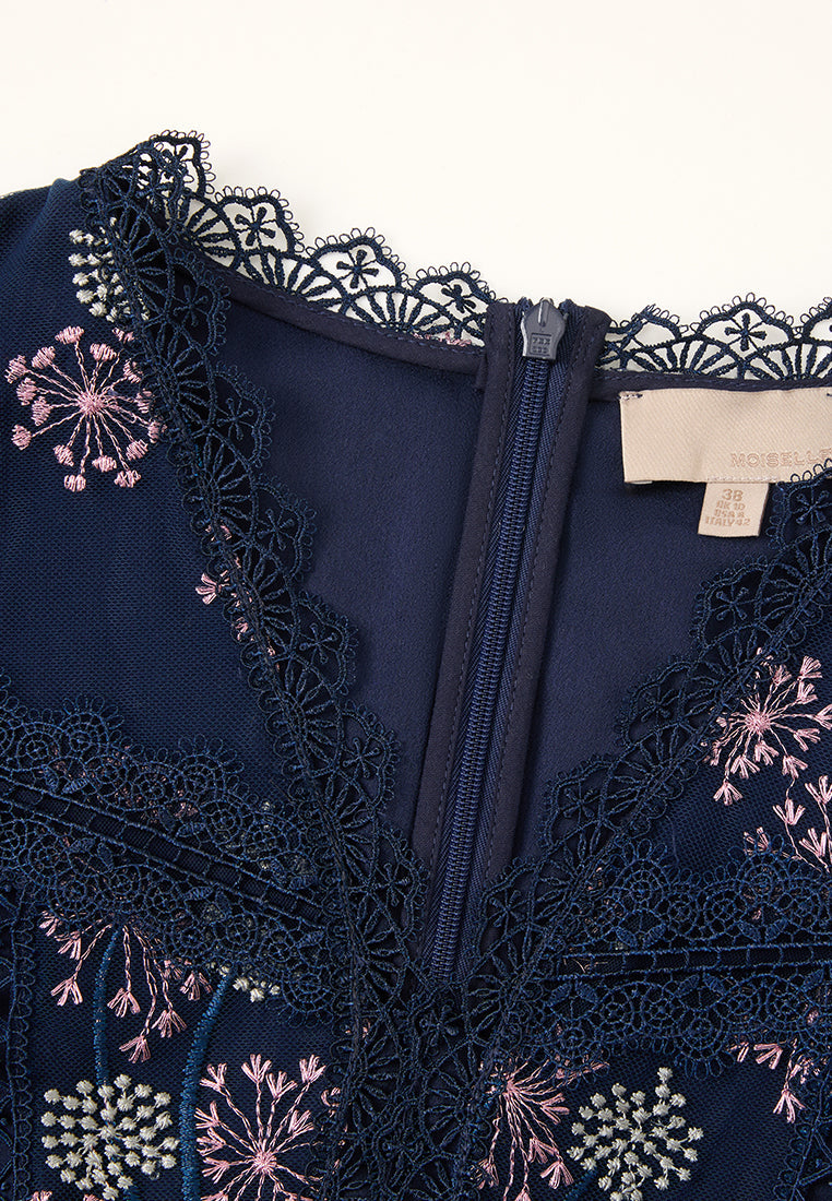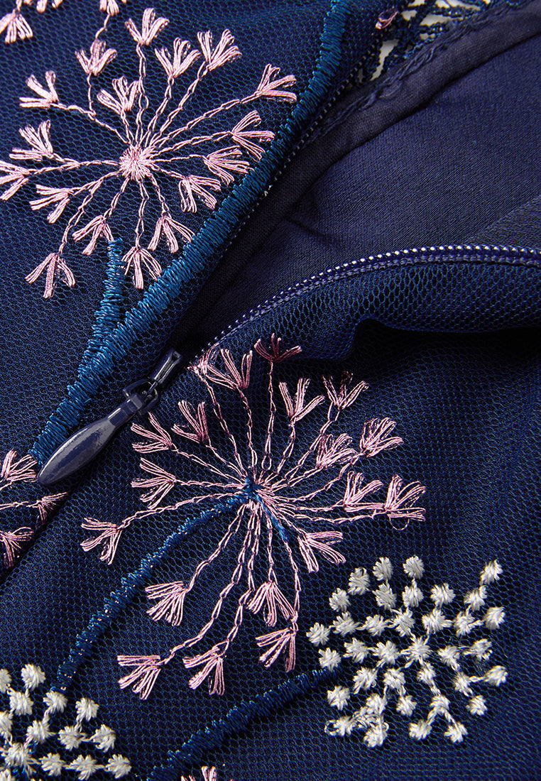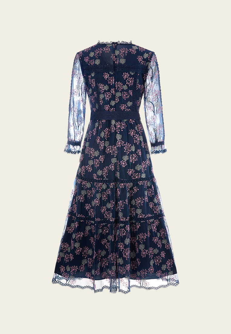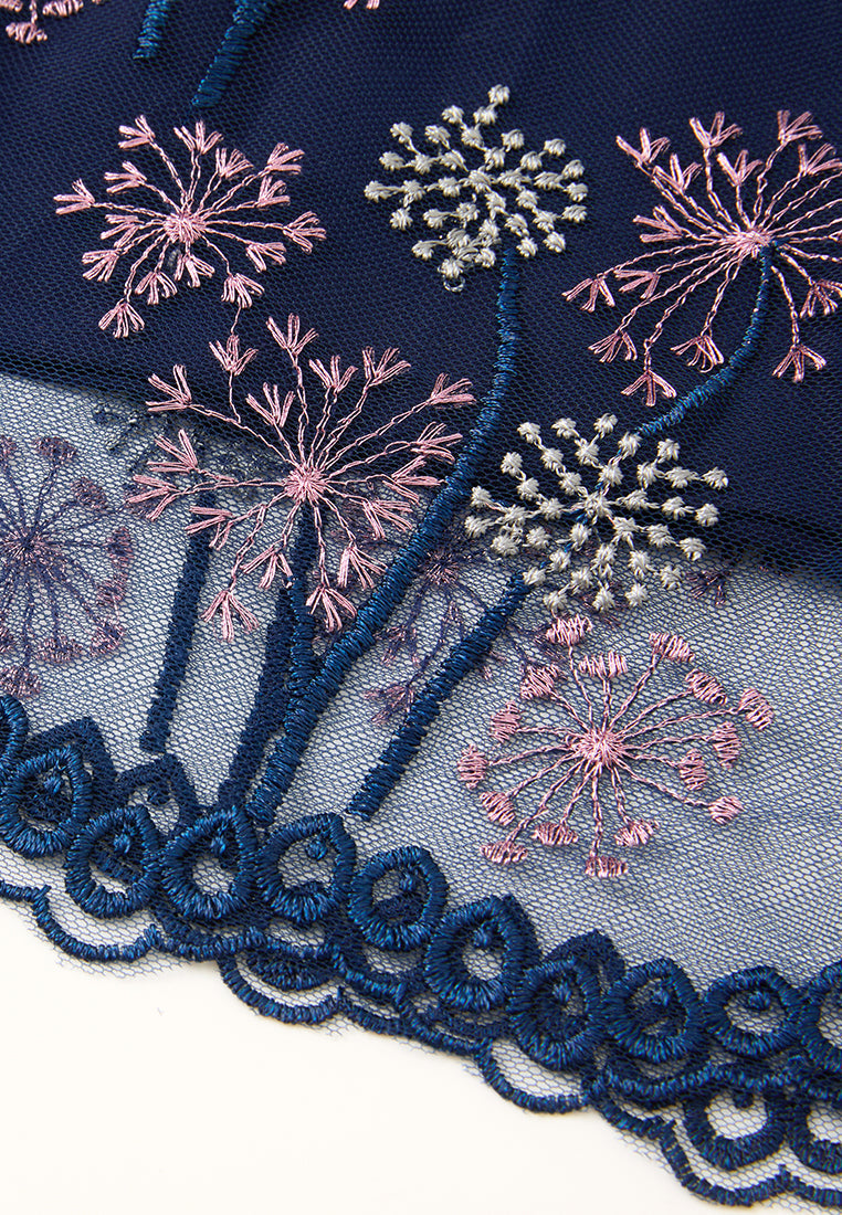 A mesh dress overlayed with delicate details: Contrasting light-colored dandelion embroidery pattern falls allover dark blue mesh. Arm skin lurks through puff sleeves. Lace trim outline the structure and panelles. Round up by a waist-accentuating tie belt.