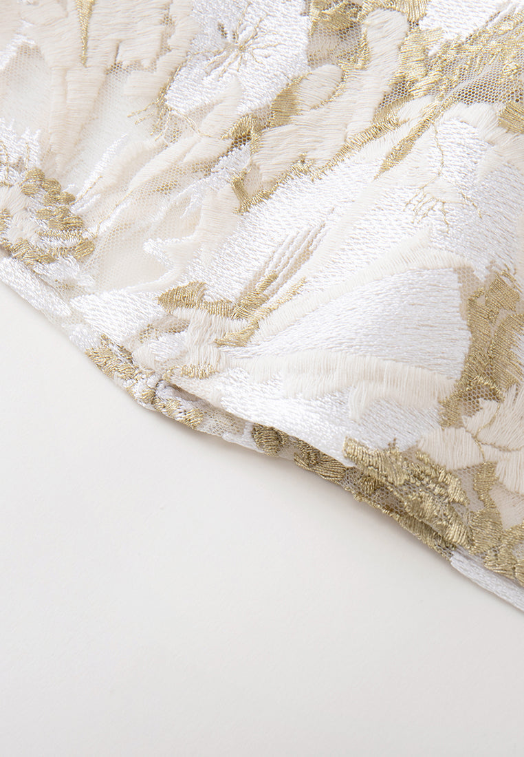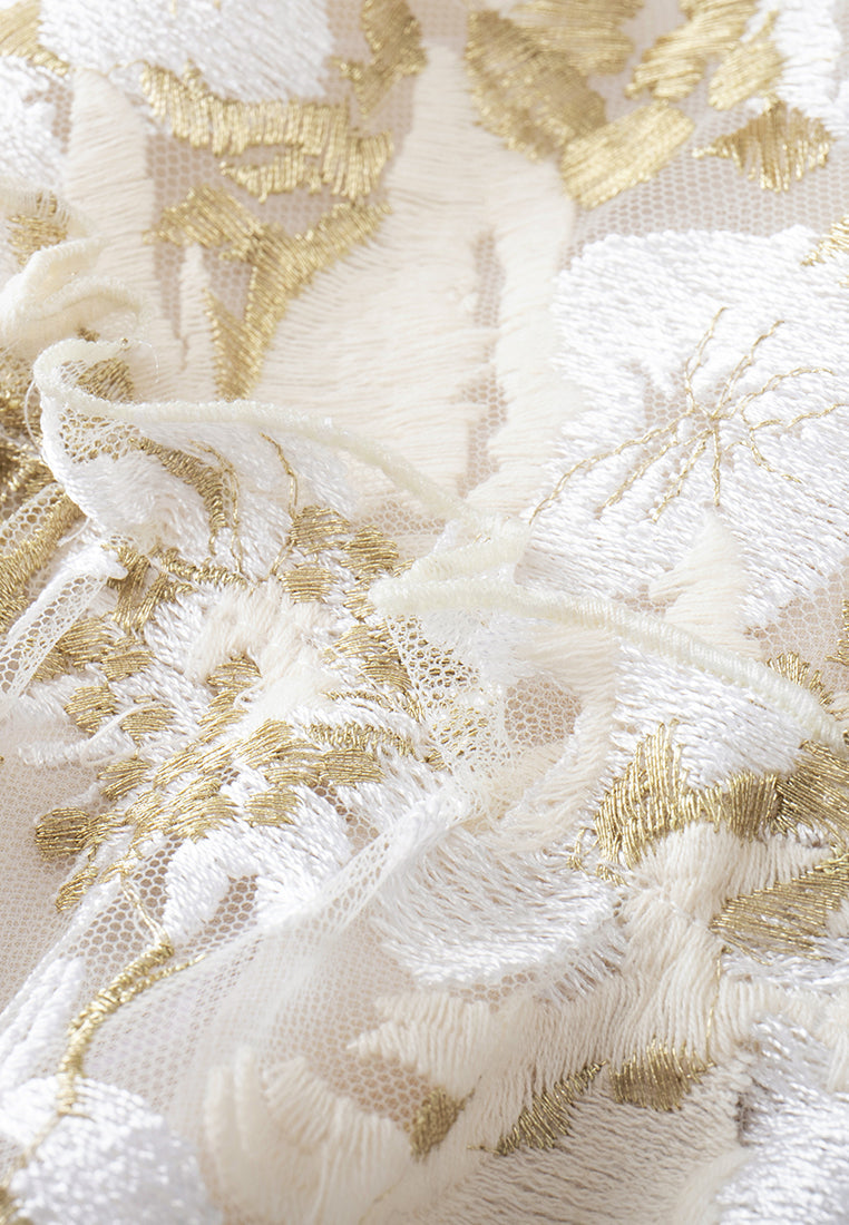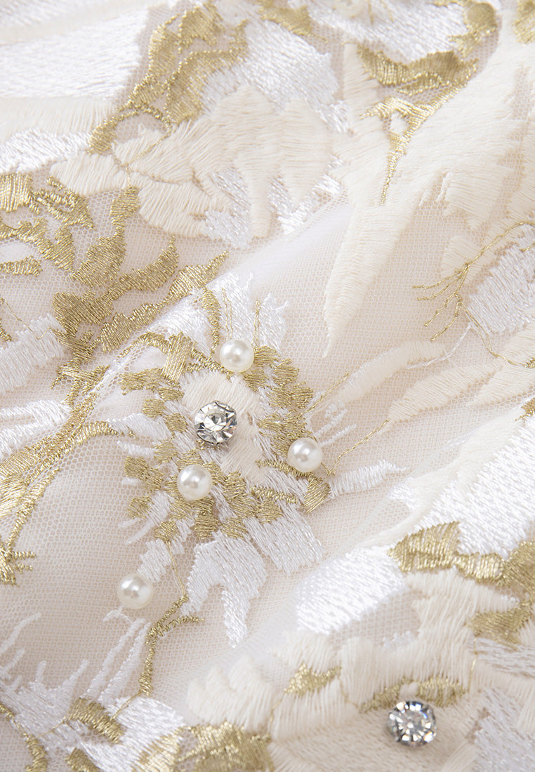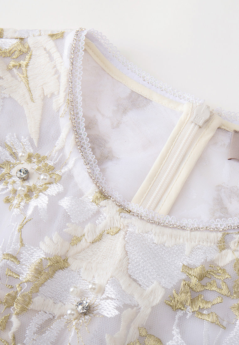 Elegant and tasteful, impress people in this lithe dress. White mesh with golden lurex and white embroideries are overlayed in an abstract floral pattern. Crystal and pearl details highlight flower cores. Lace trims. Ideal outfit for dinners and cocktail parties.