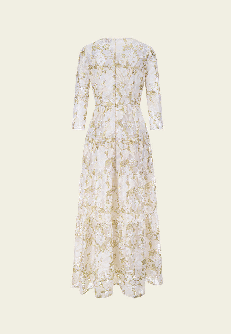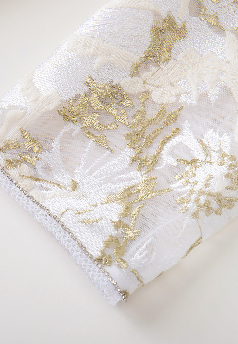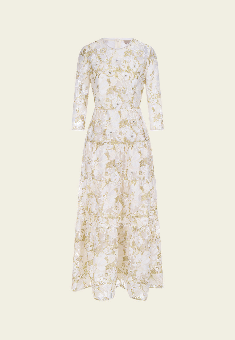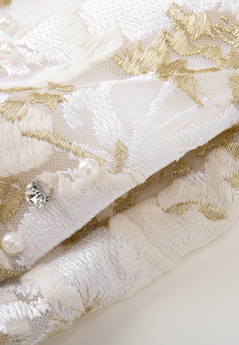 Elegant and tasteful, impress people in this lithe dress. White mesh with golden lurex and white embroideries are overlayed in an abstract floral pattern. Crystal and pearl details highlight flower cores. Lace trims. Ideal outfit for dinners and cocktail parties.