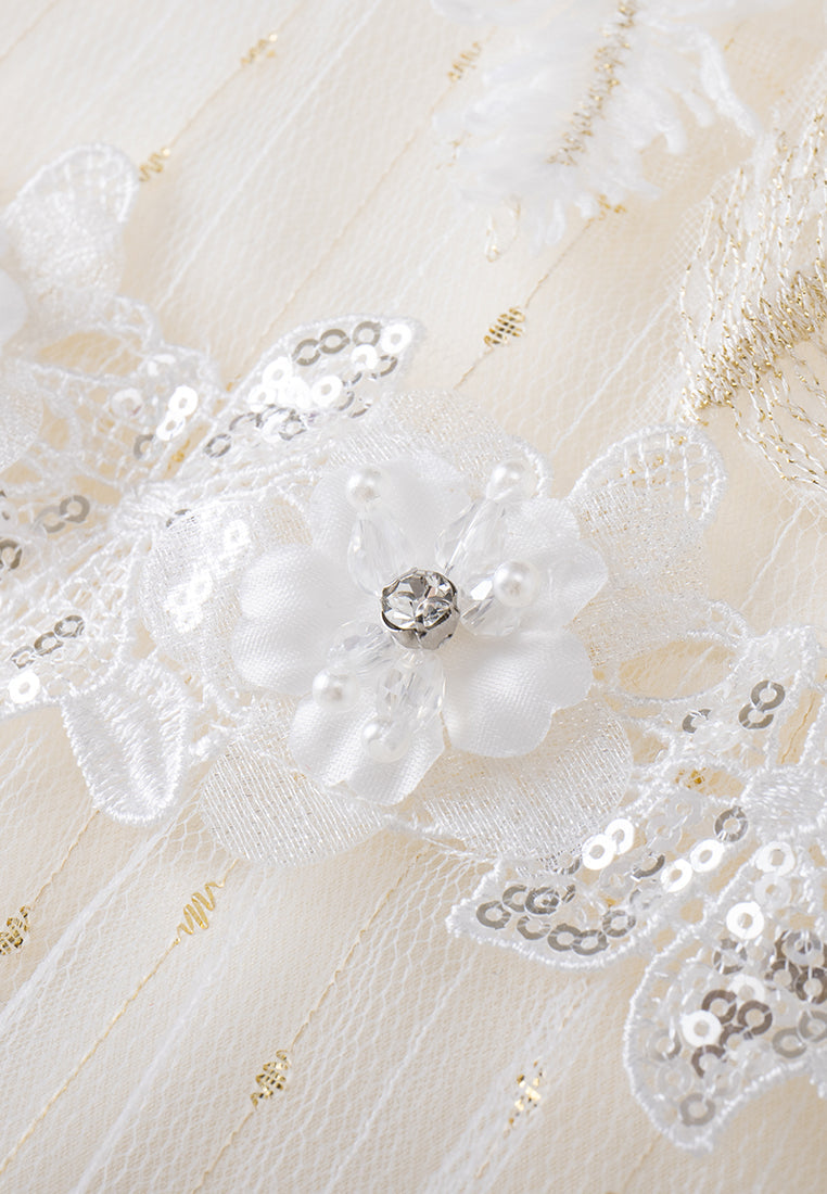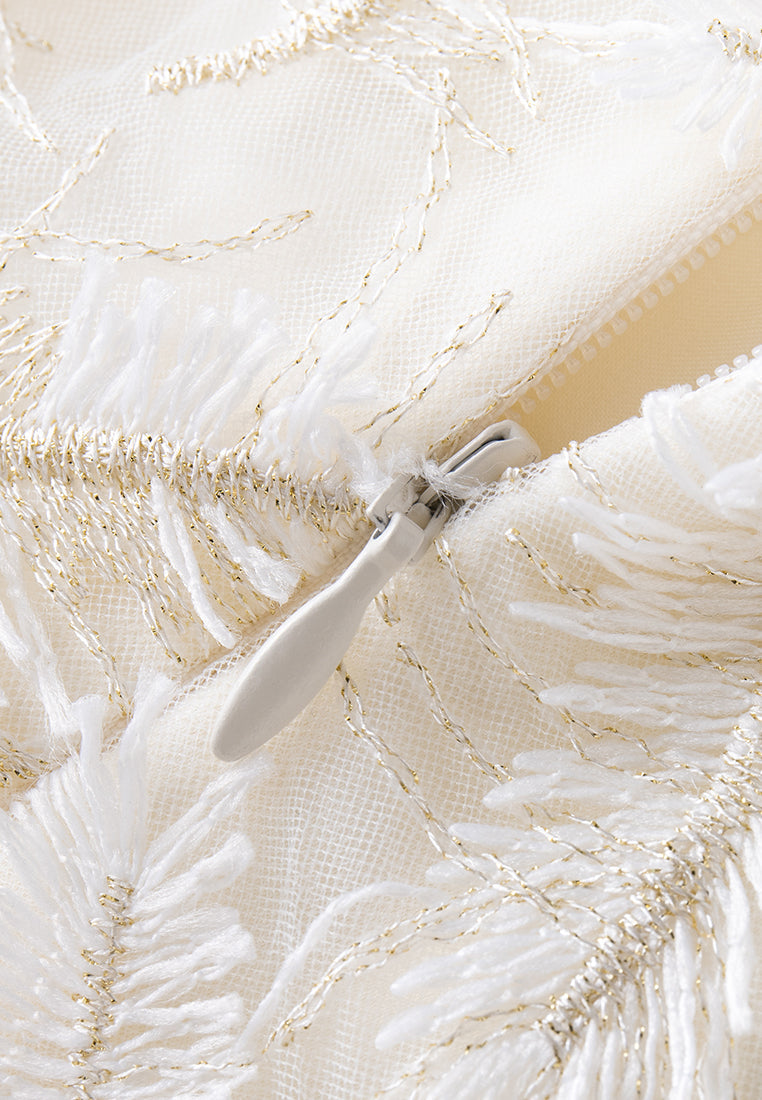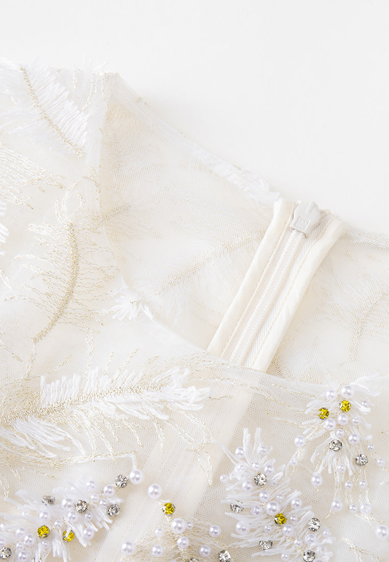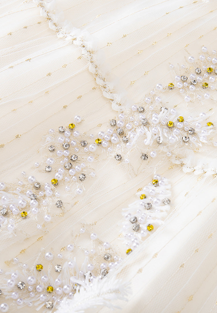 Airy and lithe, evokes unspoken temperament. White mesh sets the tone, with golden lurex linear detail overlaying the item. Pop-up feather details overlay the top part. A flow of pearl and crystal embellishment falls gracefully from the shoulder, through the waist, to the thigh. Lower body panelled into sections by lace. Round up with a row of hollow crafted lace and pop-up floral embellishment.