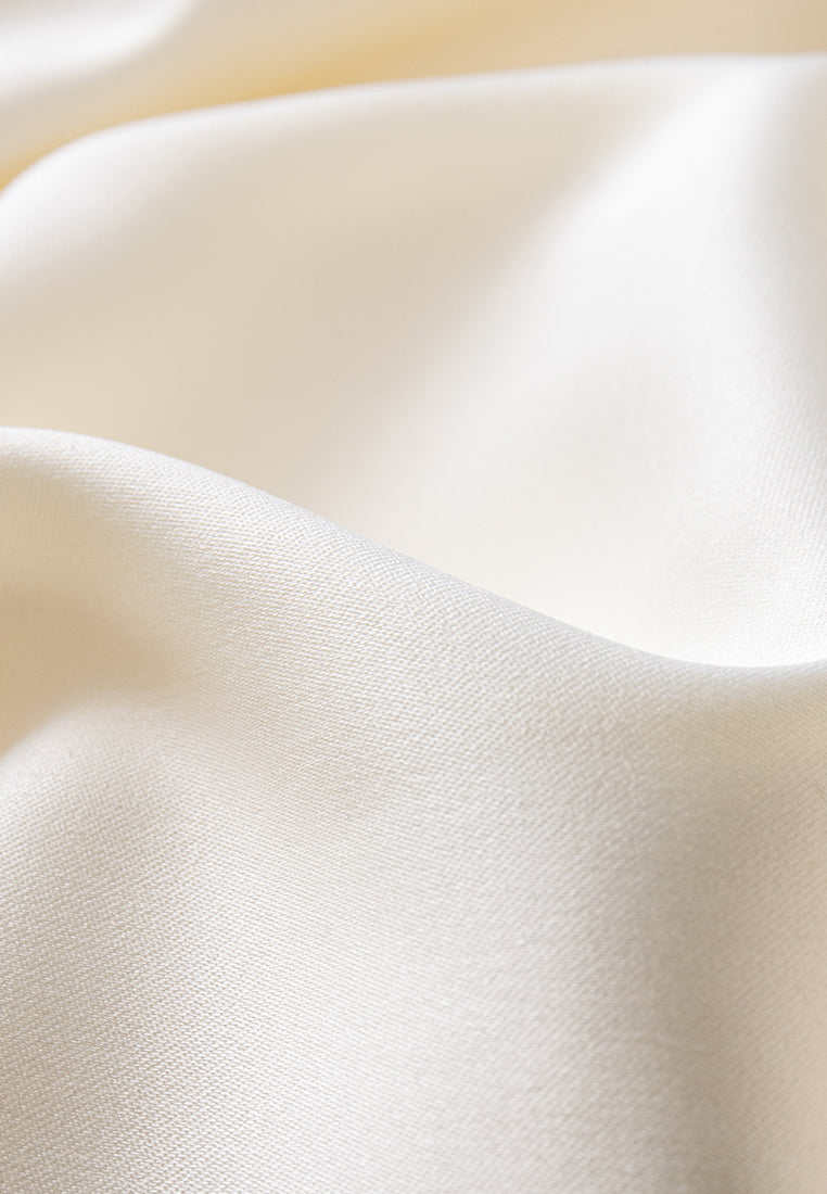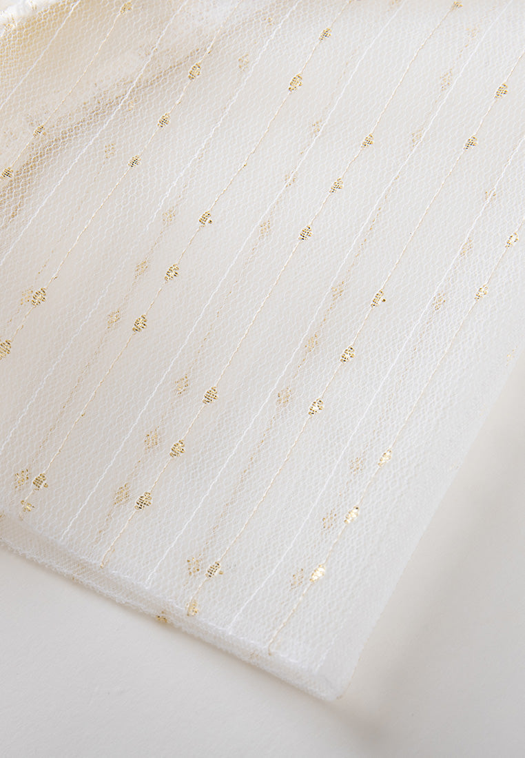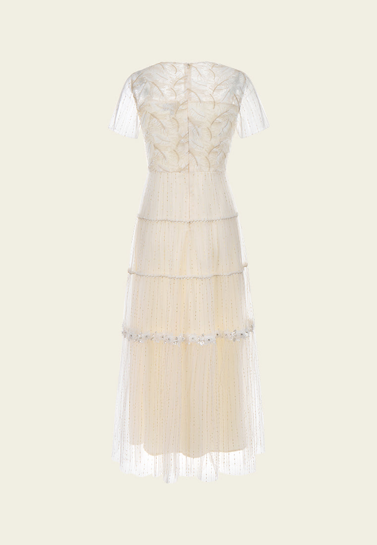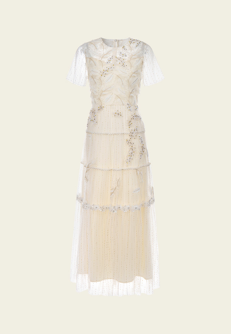 Airy and lithe, evokes unspoken temperament. White mesh sets the tone, with golden lurex linear detail overlaying the item. Pop-up feather details overlay the top part. A flow of pearl and crystal embellishment falls gracefully from the shoulder, through the waist, to the thigh. Lower body panelled into sections by lace. Round up with a row of hollow crafted lace and pop-up floral embellishment.