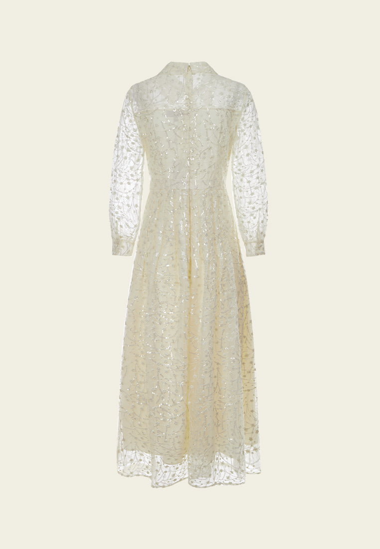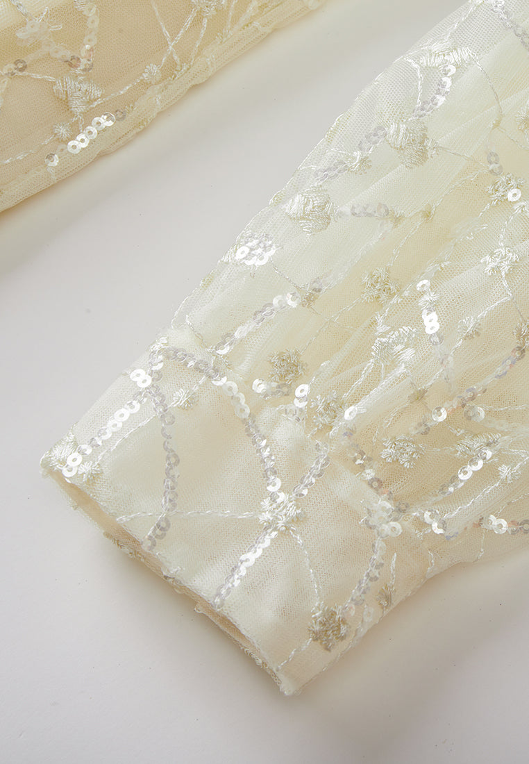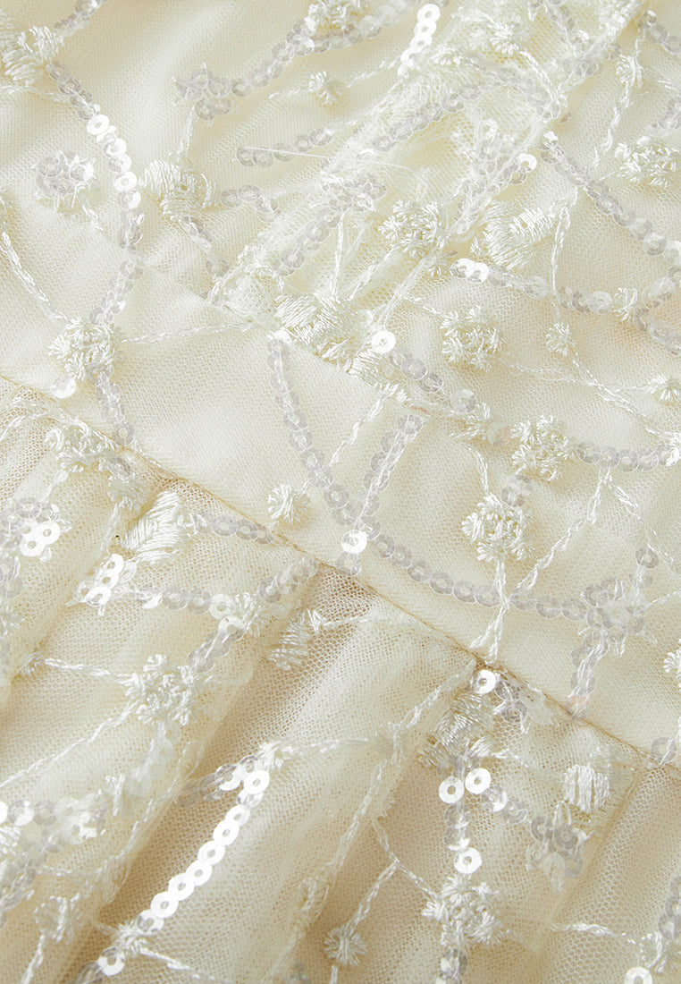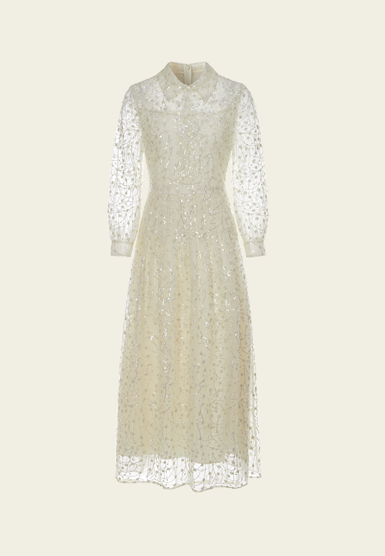 A lithe and elegant mesh dress, best for holidays and meal gatherings. Beige white sets a pure and affable tone. Intricate pattern embellished with sequins, beads, pearls and embroideries overlay. Lapeled, belt detail, zip fastening.