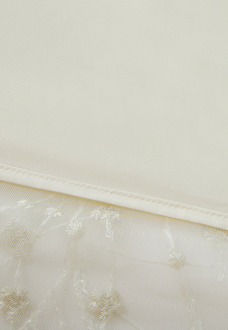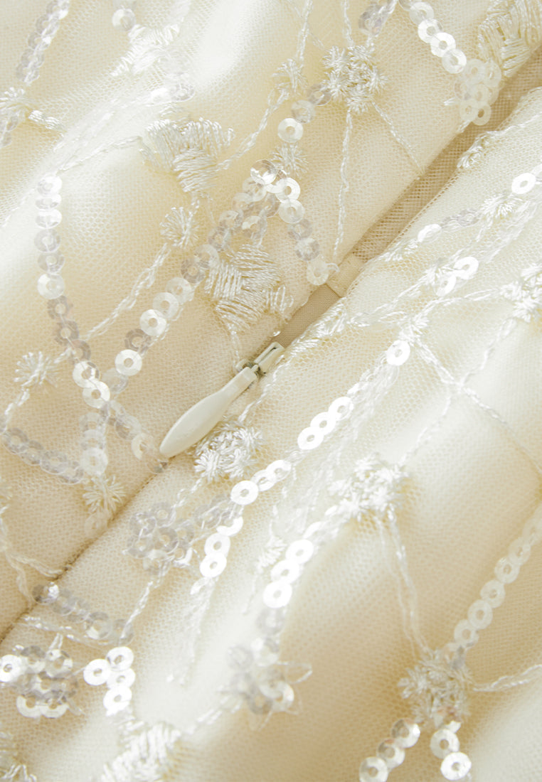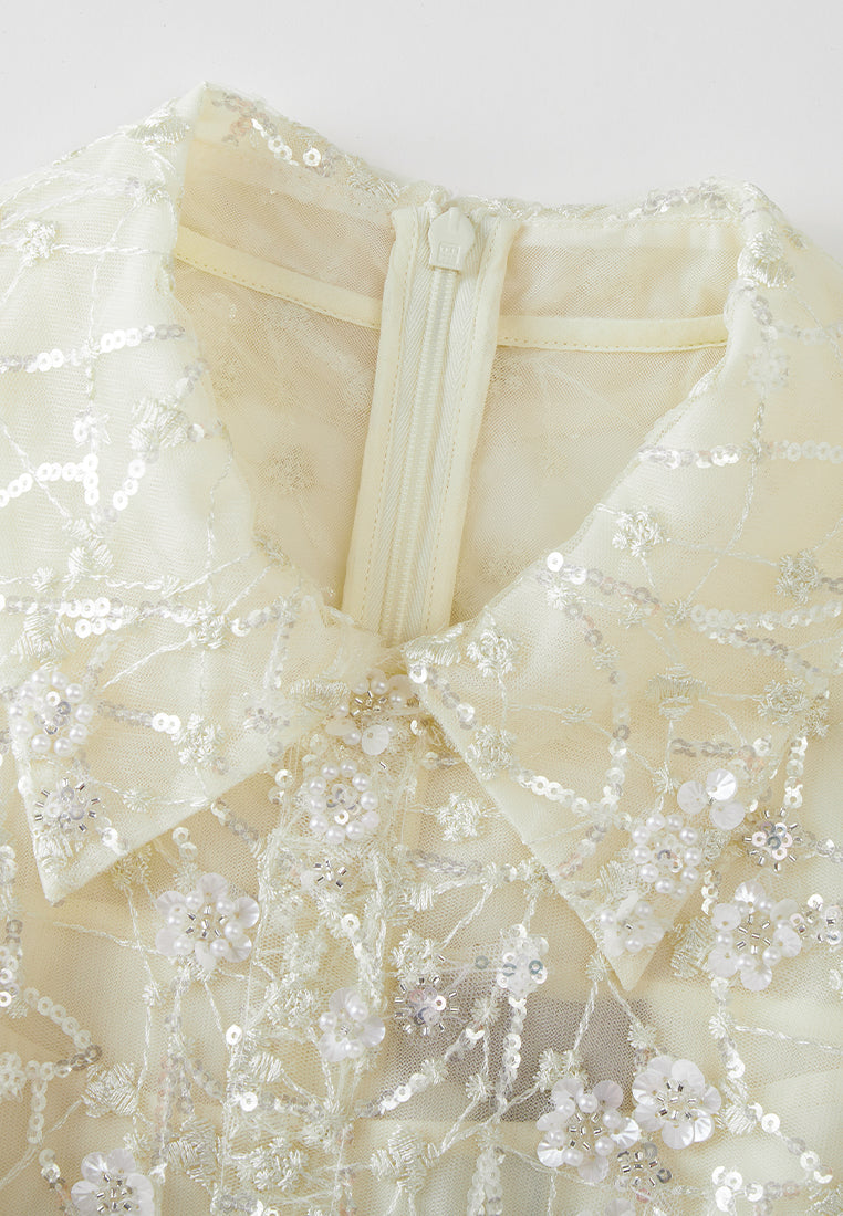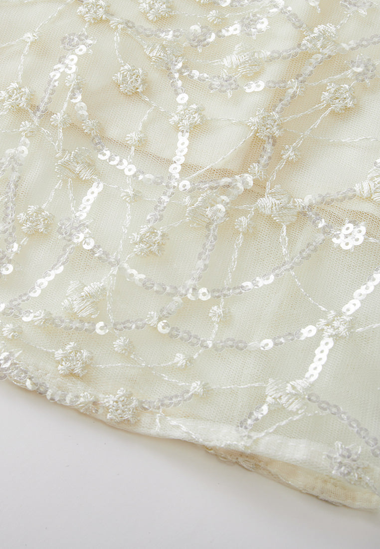 A lithe and elegant mesh dress, best for holidays and meal gatherings. Beige white sets a pure and affable tone. Intricate pattern embellished with sequins, beads, pearls and embroideries overlay. Lapeled, belt detail, zip fastening.