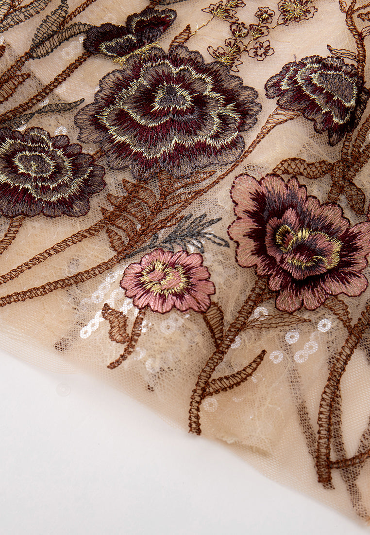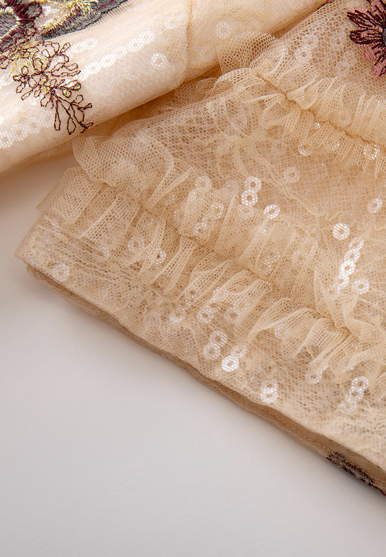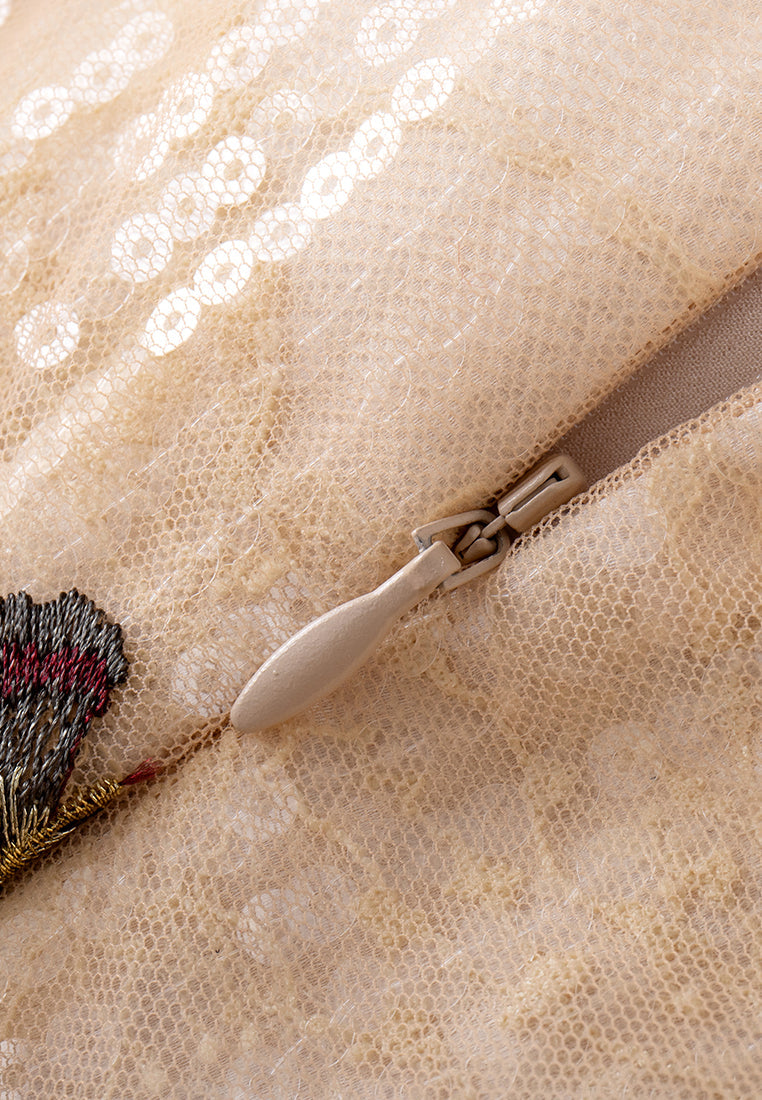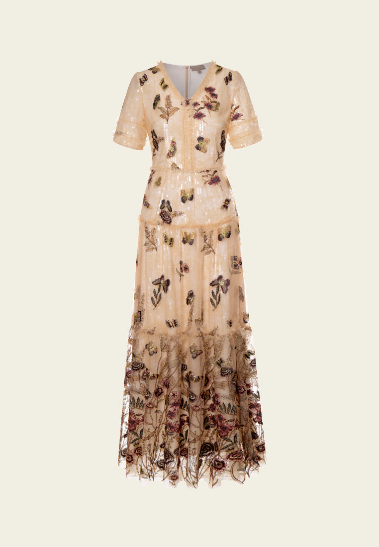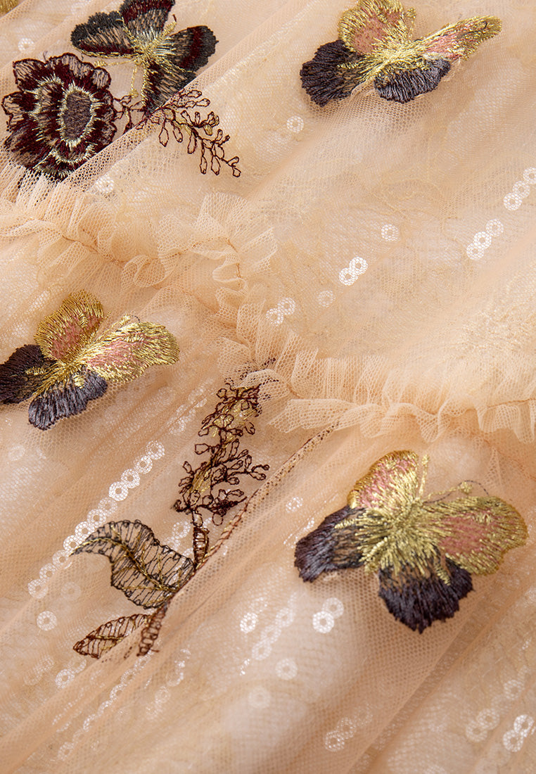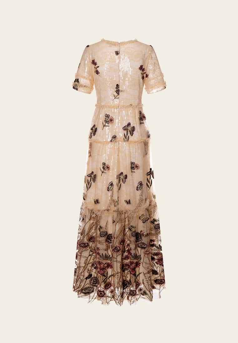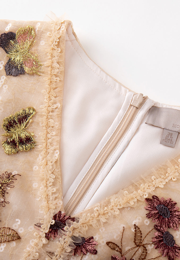 An elegant, refined dress with opulent details, perfect for cocktail parties and balls. Soft beige lace with a layer of translucent sequins flicker in the middle, and a layer of mesh on top. Dark tone embroidered flowers in clusters at the calves, butterflies overlay, reminiscent of being in a garden at dawn.