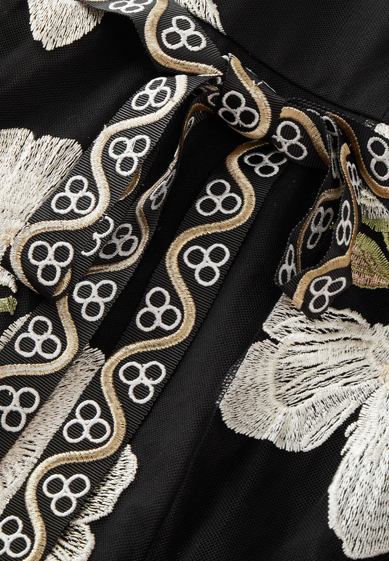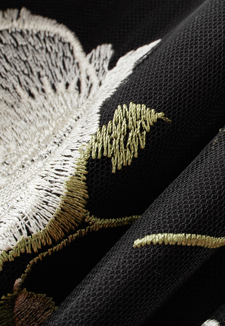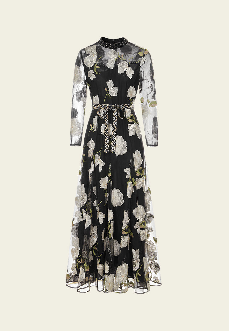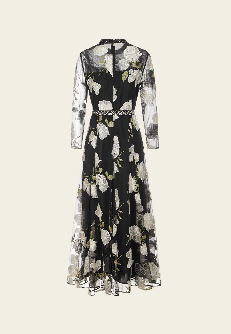 A mesh dress with appealing details in contrast, made for sophisticated female entrepreneurs attending public events and nighttime gatherings. Black colorway evokes a timeless feeling. Boasts contrasting punchy white floral embroideries overlay. Round up with an embellished stand collar and waist accentuating tie-belt.