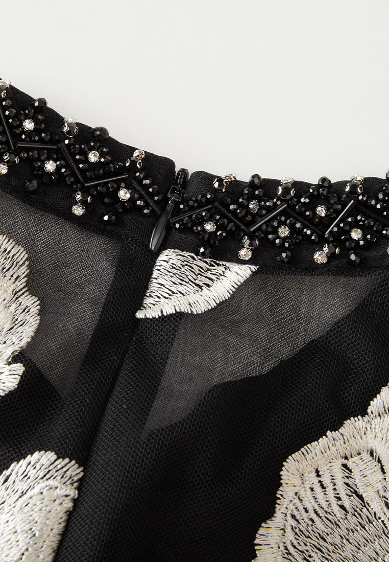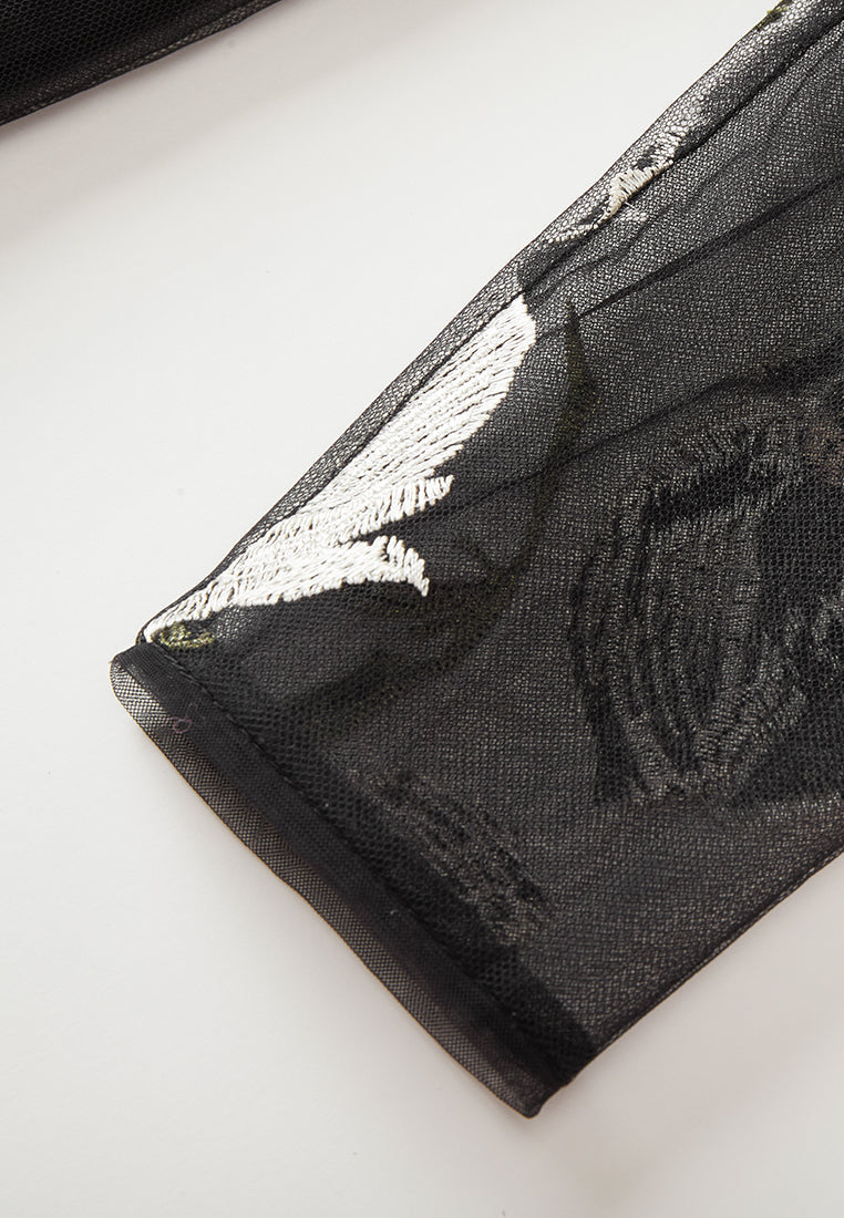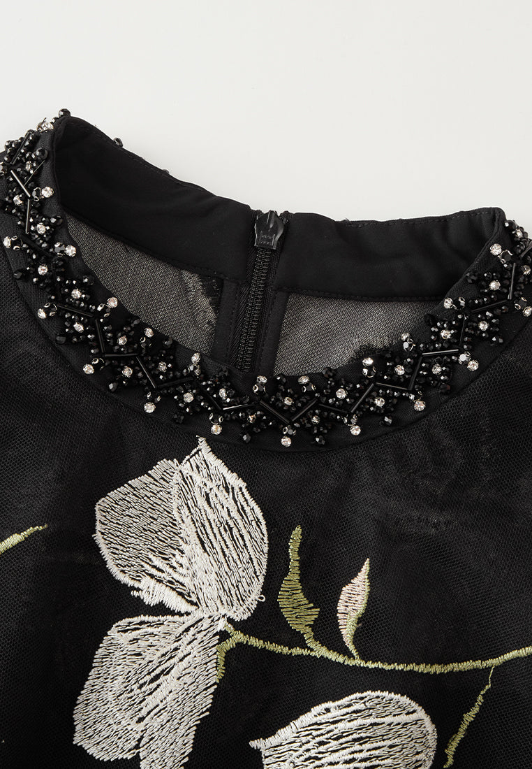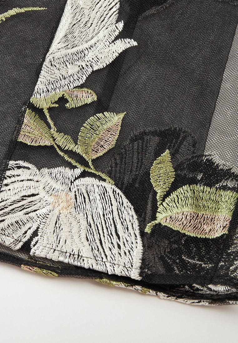 A mesh dress with appealing details in contrast, made for sophisticated female entrepreneurs attending public events and nighttime gatherings. Black colorway evokes a timeless feeling. Boasts contrasting punchy white floral embroideries overlay. Round up with an embellished stand collar and waist accentuating tie-belt.