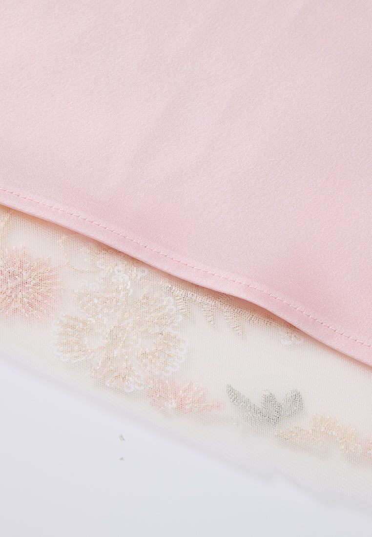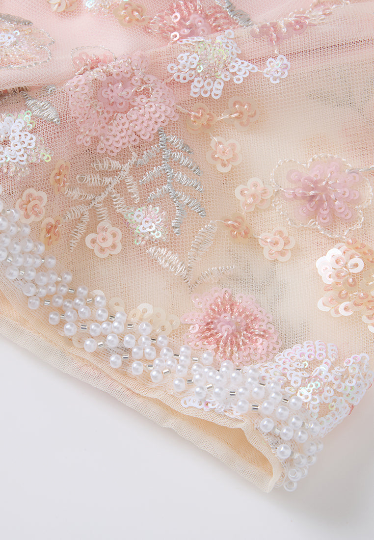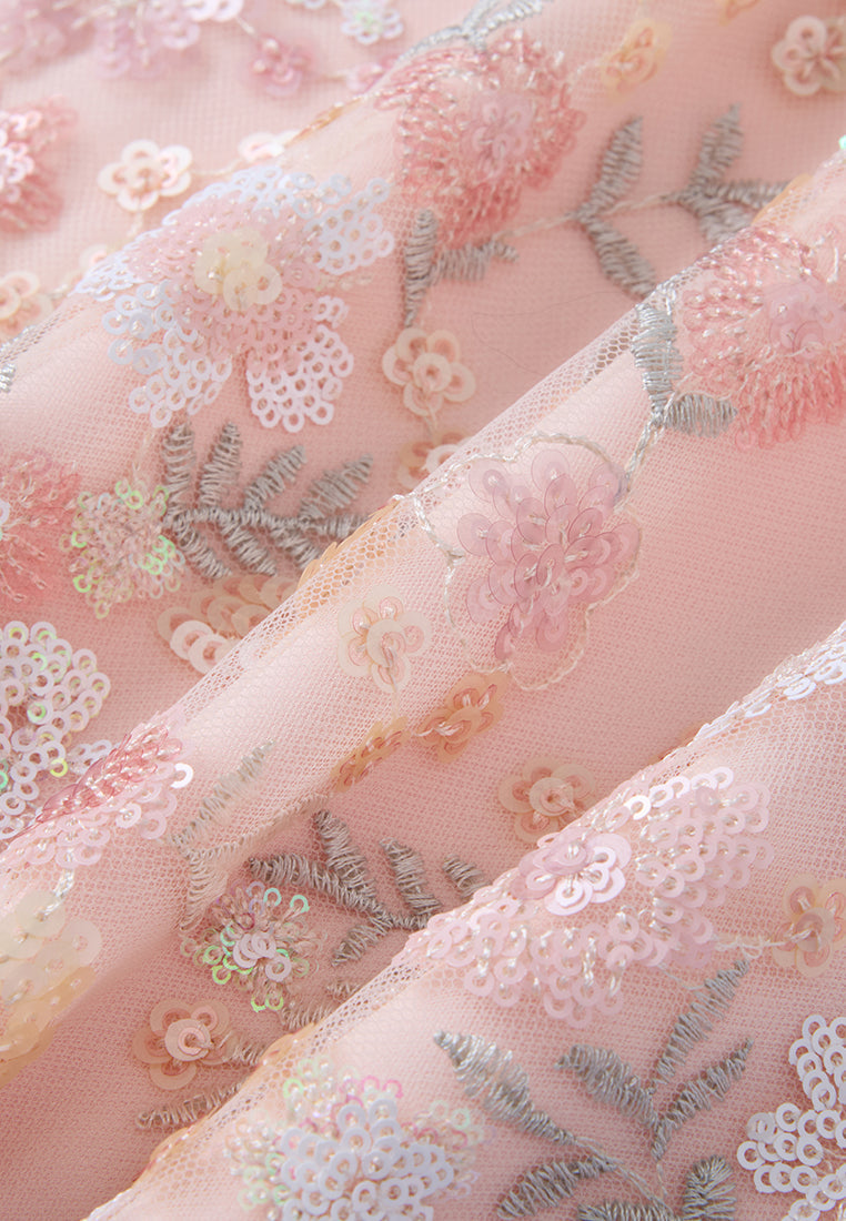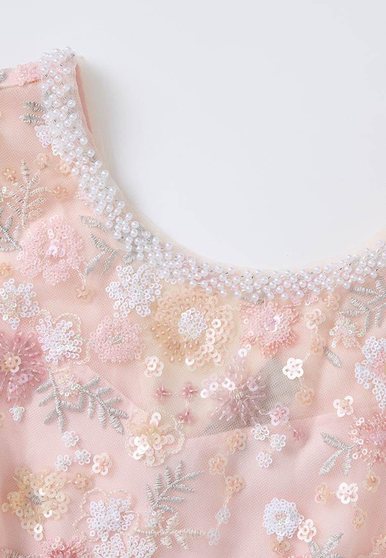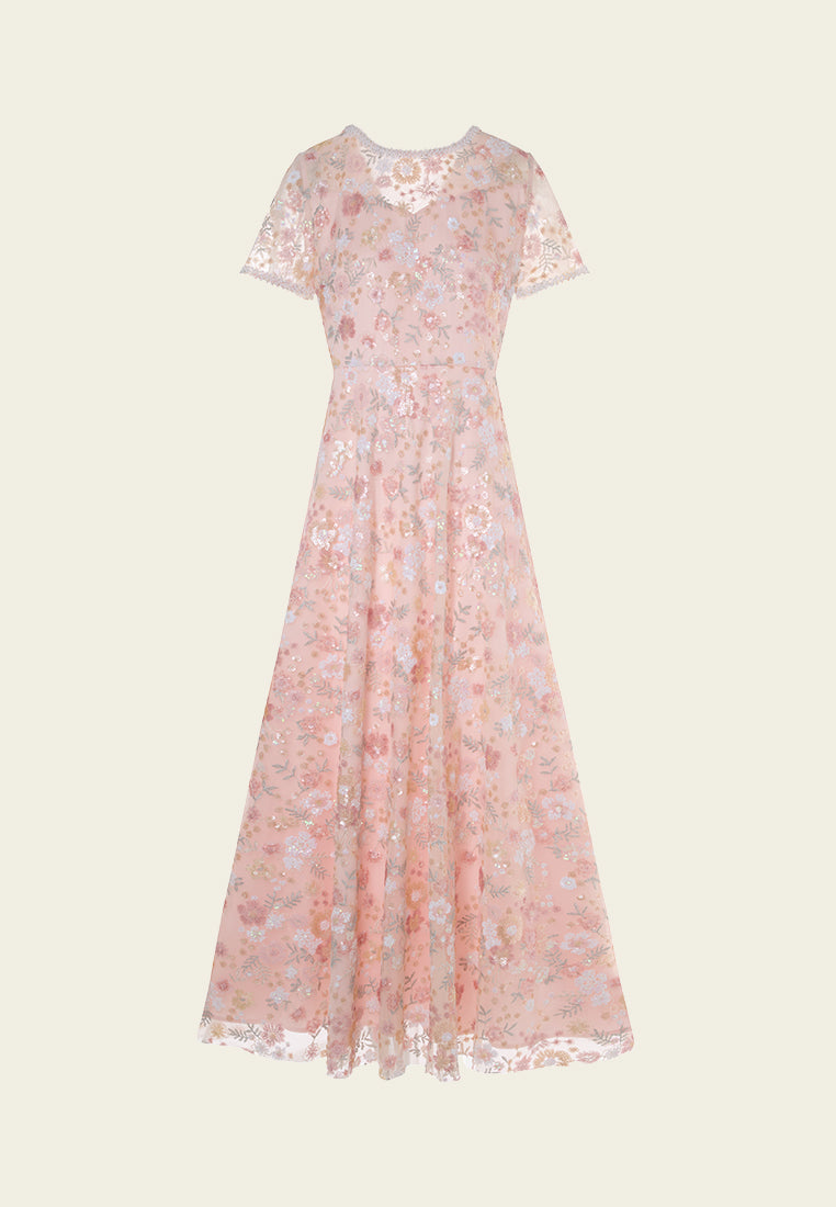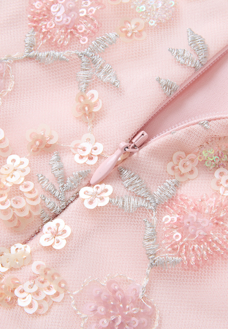 A delicate maxi dress that you won't want to miss. The light pink colorway evokes your feminine temperament. Exquisite embroidered and sequined floral pattern in pastel tone overlay a maxi mesh dress. Round up with faux pearl trims outline the collar and cuffs. Put it on to make heads turn at cocktail parties.