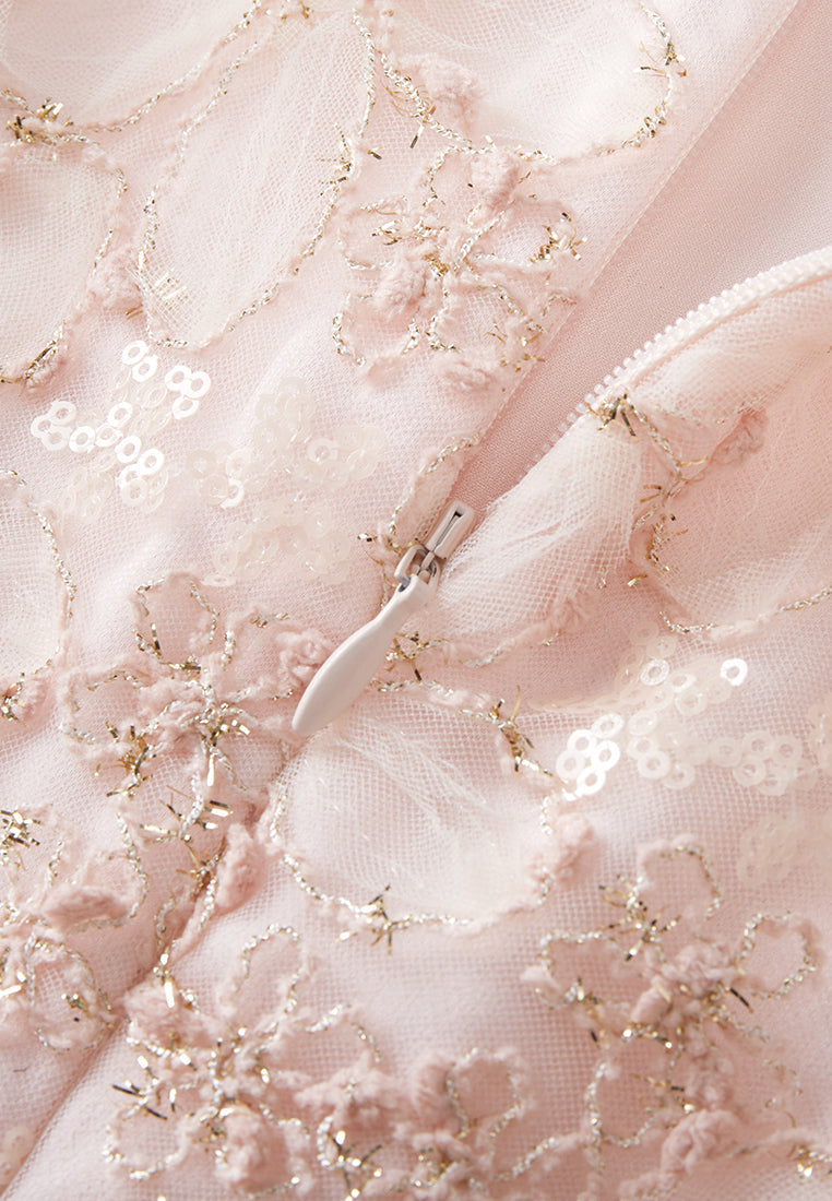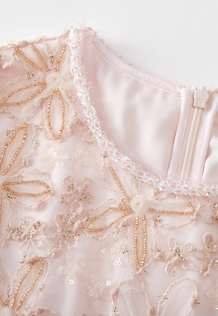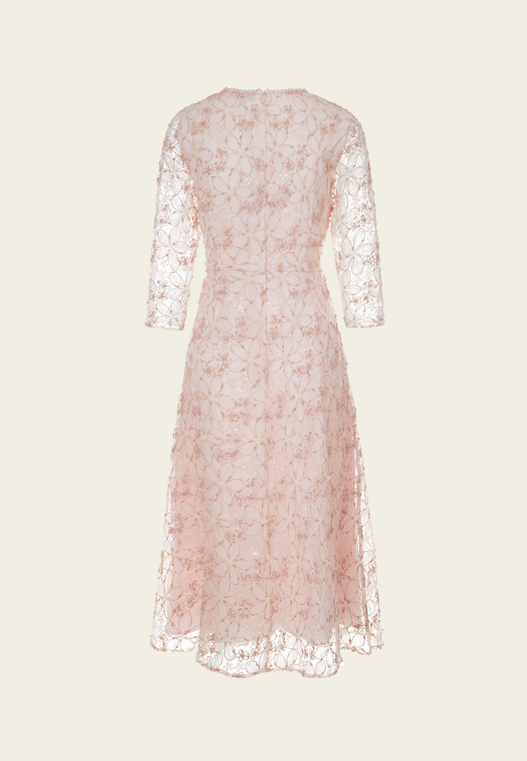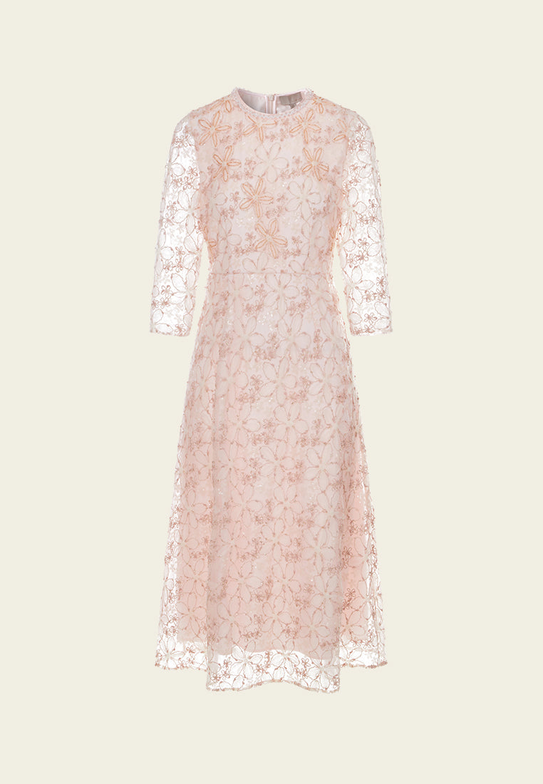 An elegant a-line dress filled with abundant details, ideal for cocktail parties and celeberative events. Embroidery floral pattern overlays, embellished with golden colorway beads, lurex and sequins. A-line silhouette accentuate waistline. Round up with beaded lace trim at the collar and the hem.