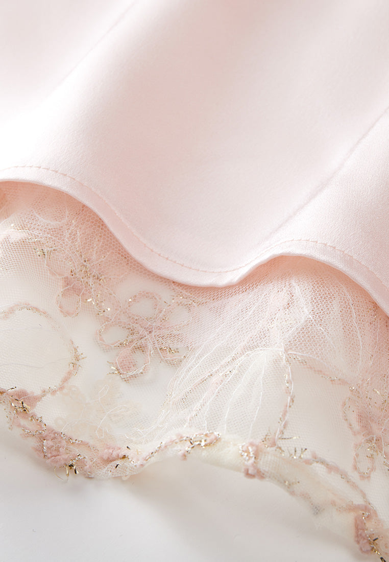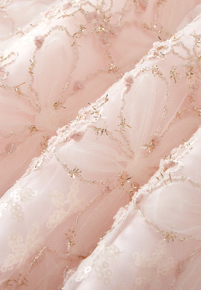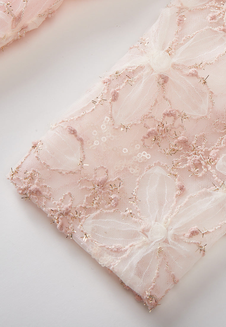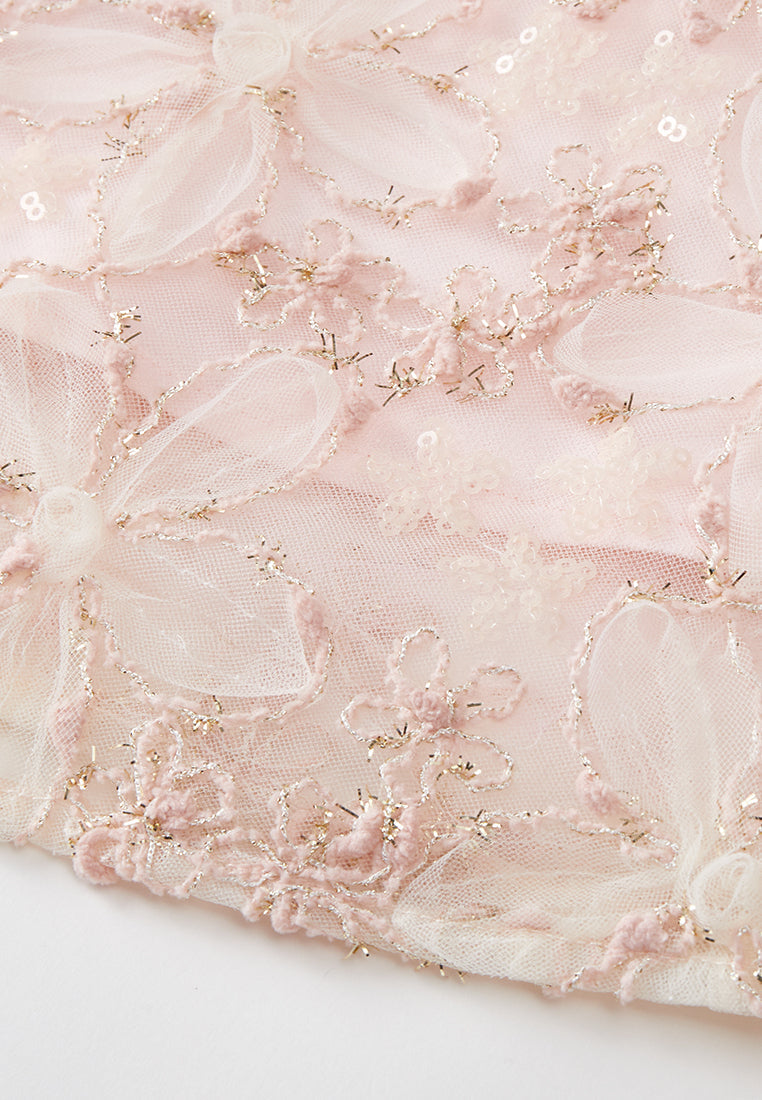 An elegant a-line dress filled with abundant details, ideal for cocktail parties and celeberative events. Embroidery floral pattern overlays, embellished with golden colorway beads, lurex and sequins. A-line silhouette accentuate waistline. Round up with beaded lace trim at the collar and the hem.