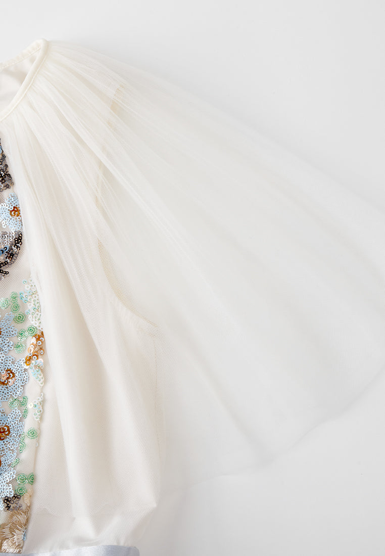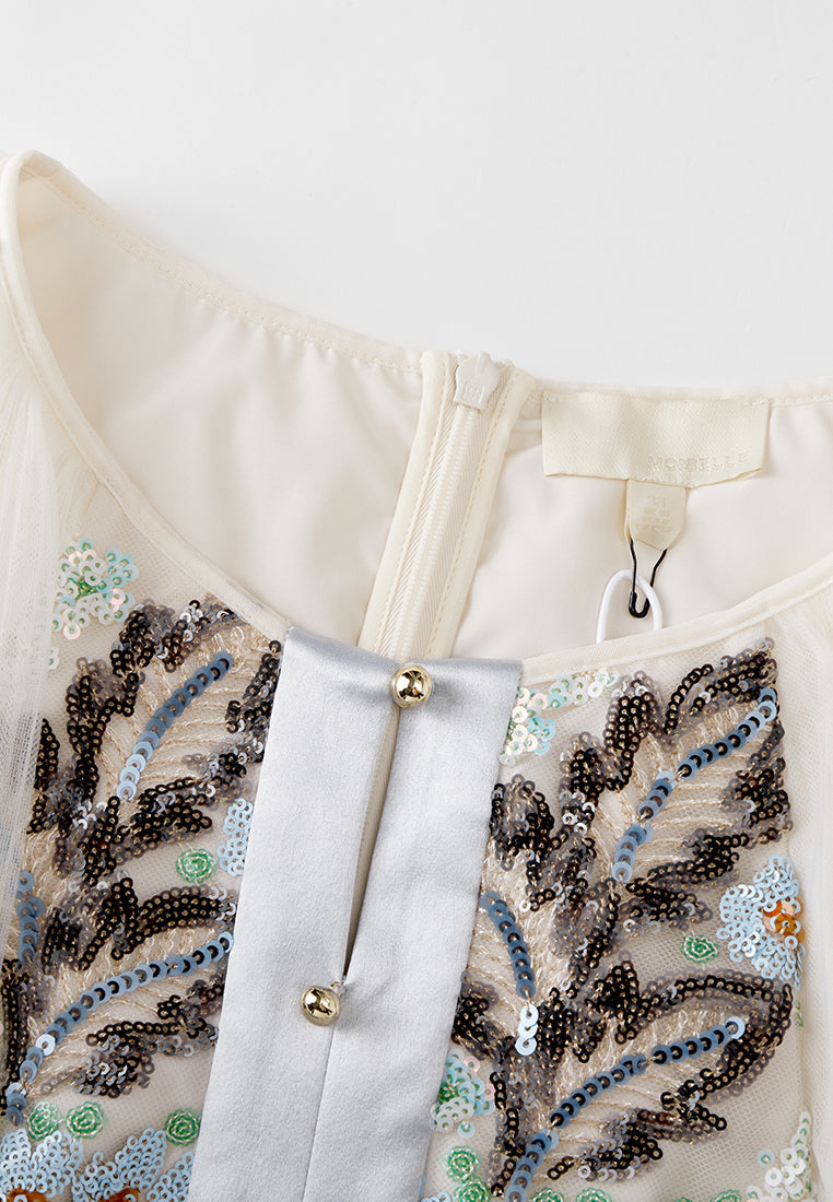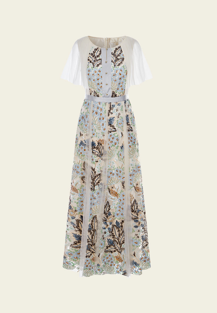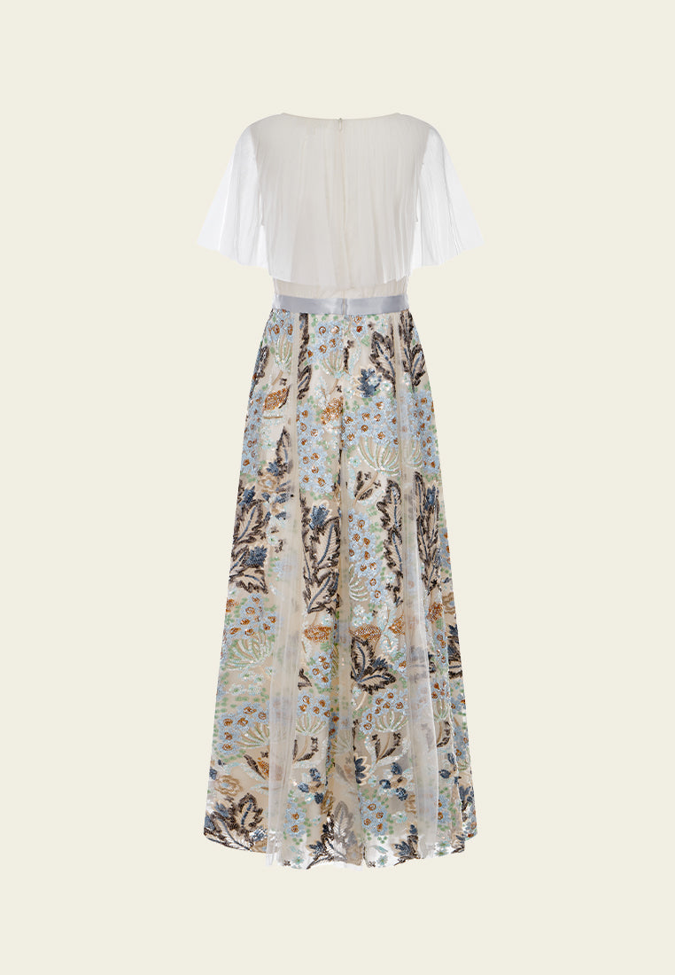 A prestigious and elegant mesh dress filled with opulent details, best for female entrepreneurs attending cocktail parties and public events. Cape detail surrounding the shoulder. Boasts panelled details intricately embellished with embroidered and sequined floral pattern.