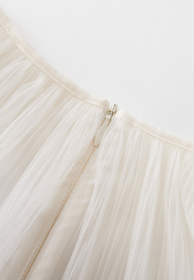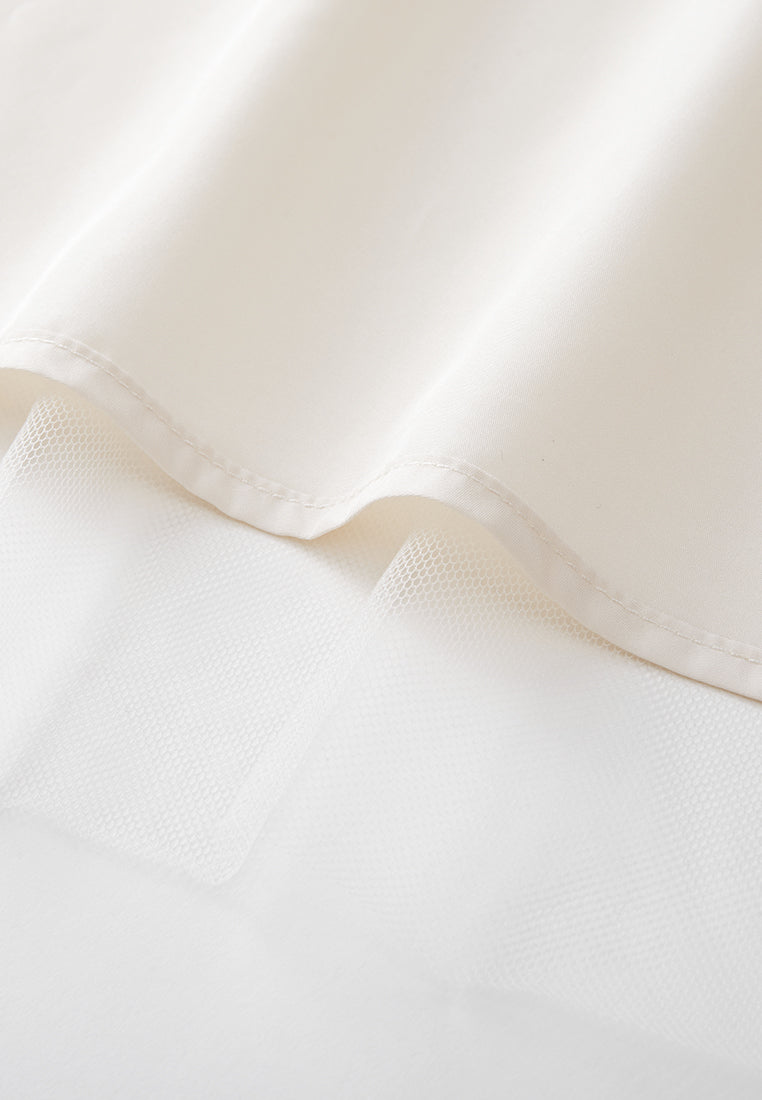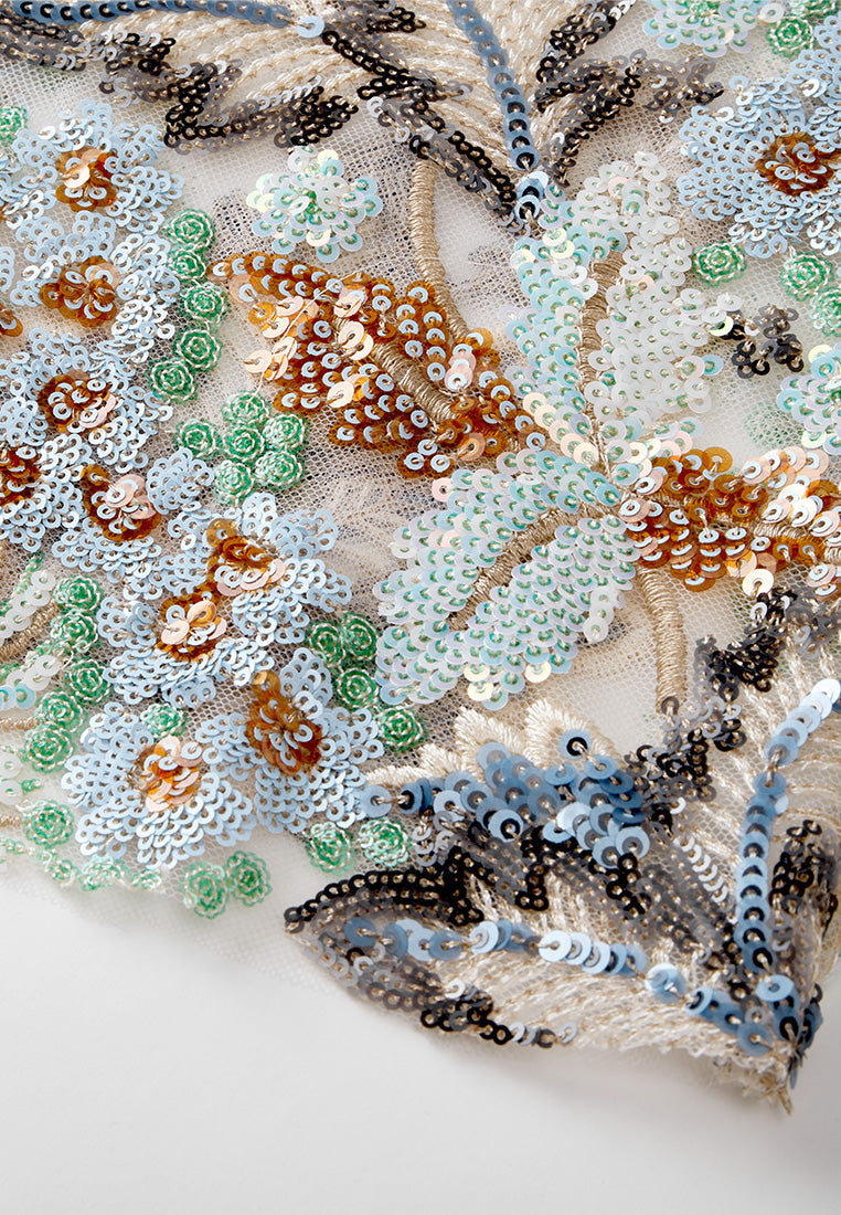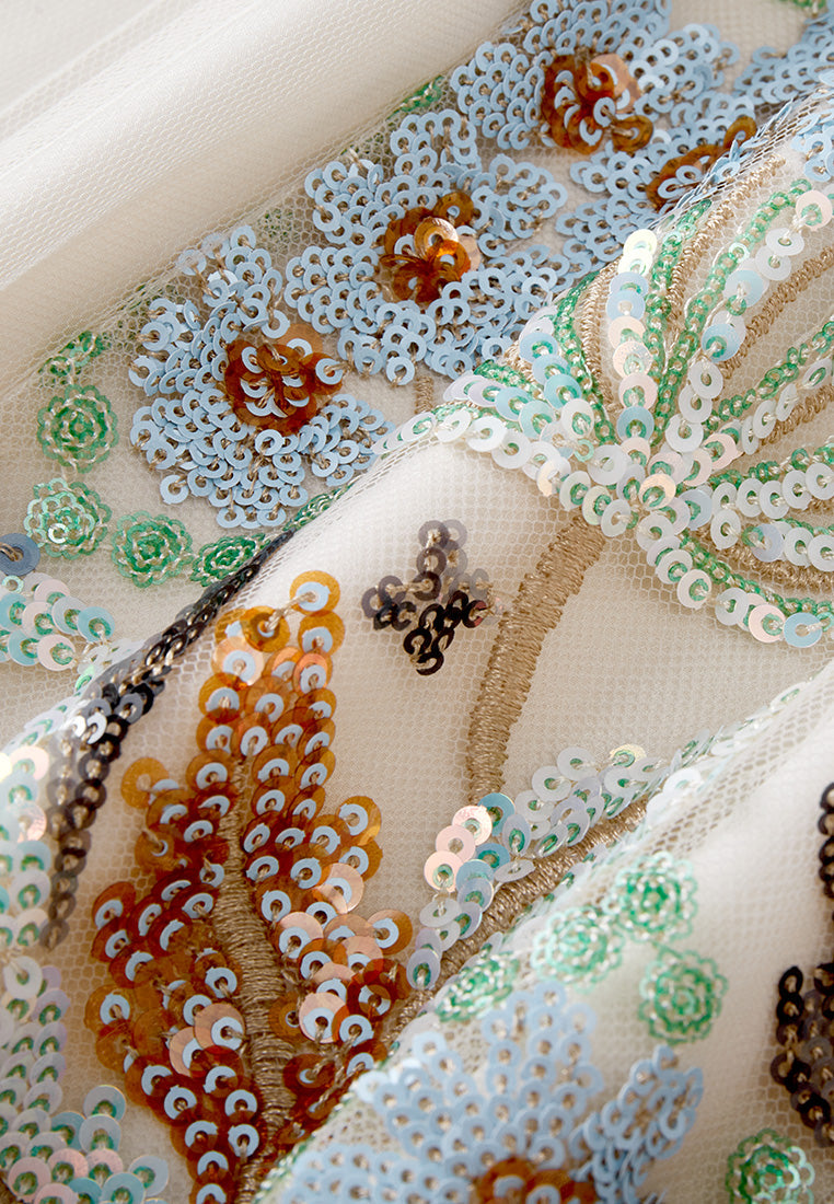 A prestigious and elegant mesh dress filled with opulent details, best for female entrepreneurs attending cocktail parties and public events. Cape detail surrounding the shoulder. Boasts panelled details intricately embellished with embroidered and sequined floral pattern.