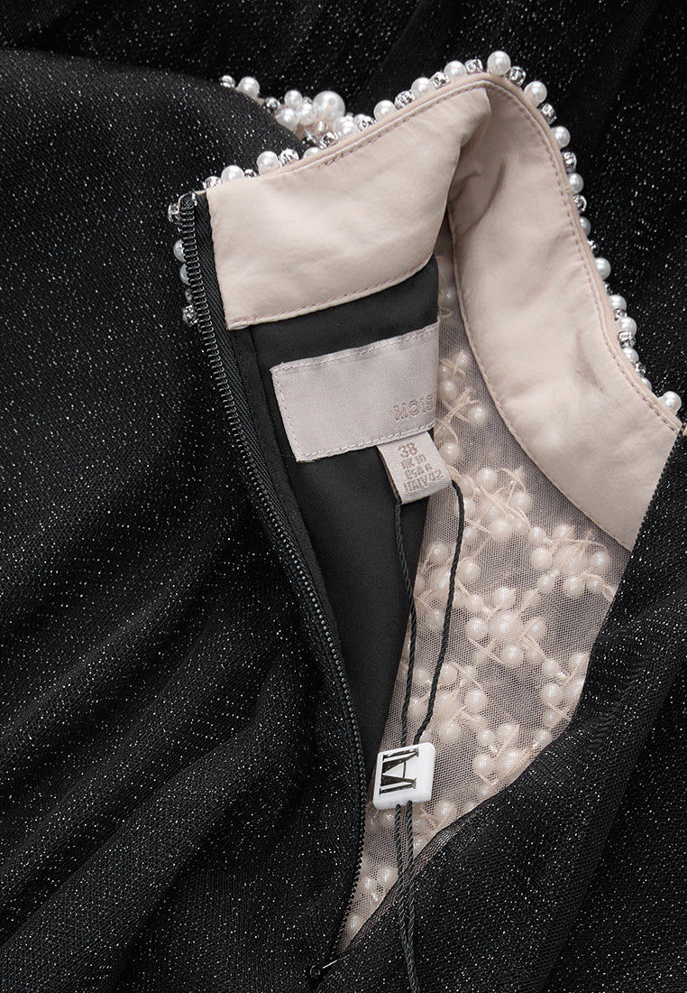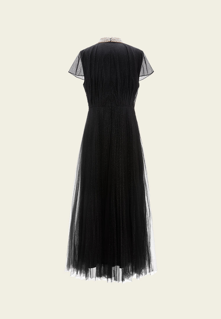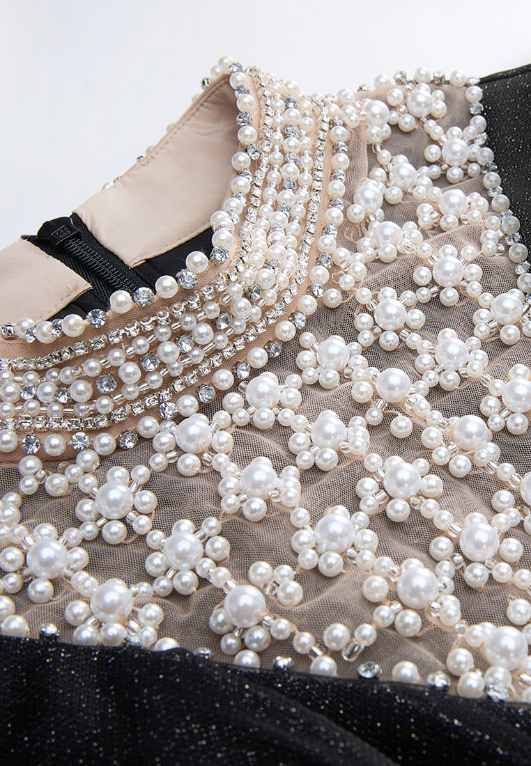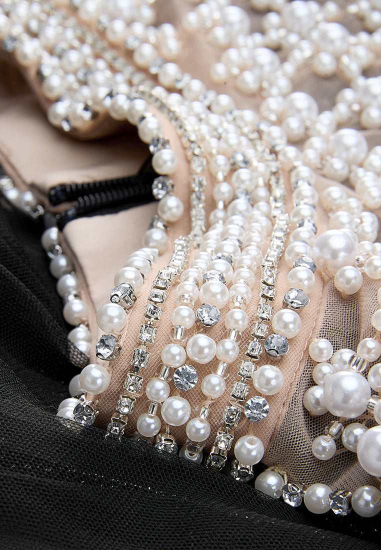 A luxurious gown, perfect for nighttime datings, cocktail parties and balls. A v-neck panel with patterned embellishment made with pearls and crystals. Black organza with interwoven lurex shimmers in every angle. Pleated detail below the bust. Cap sleeves.