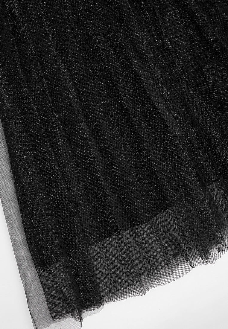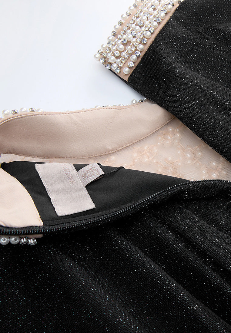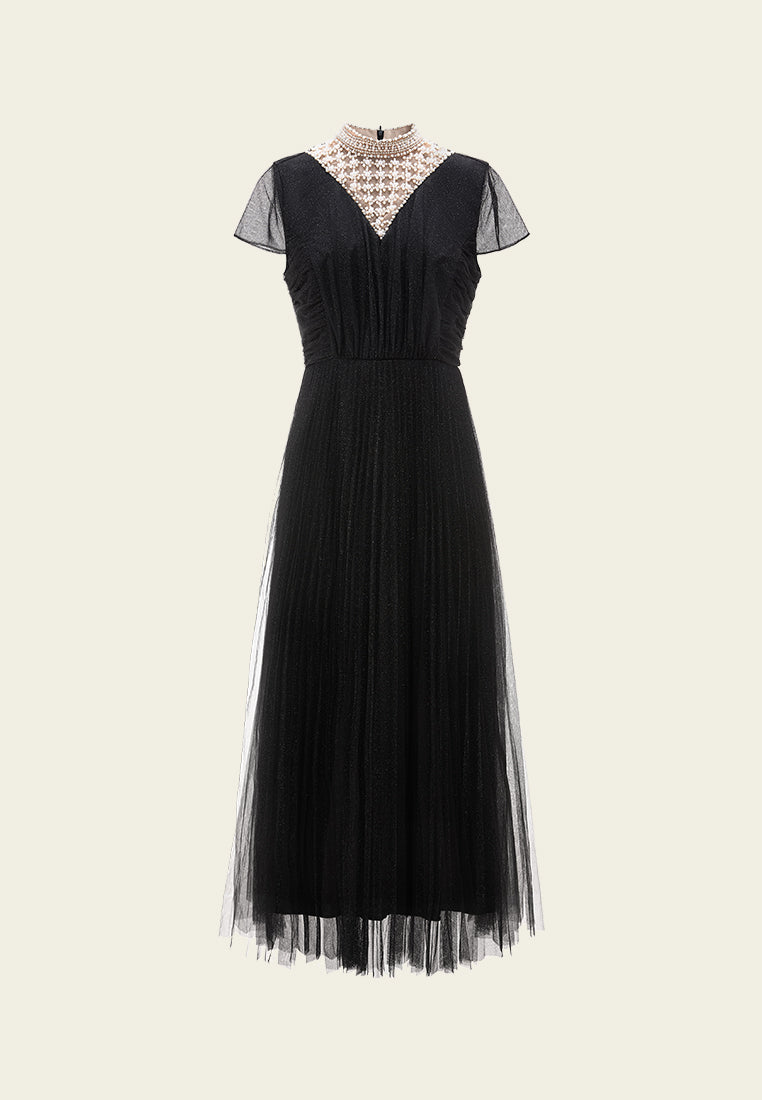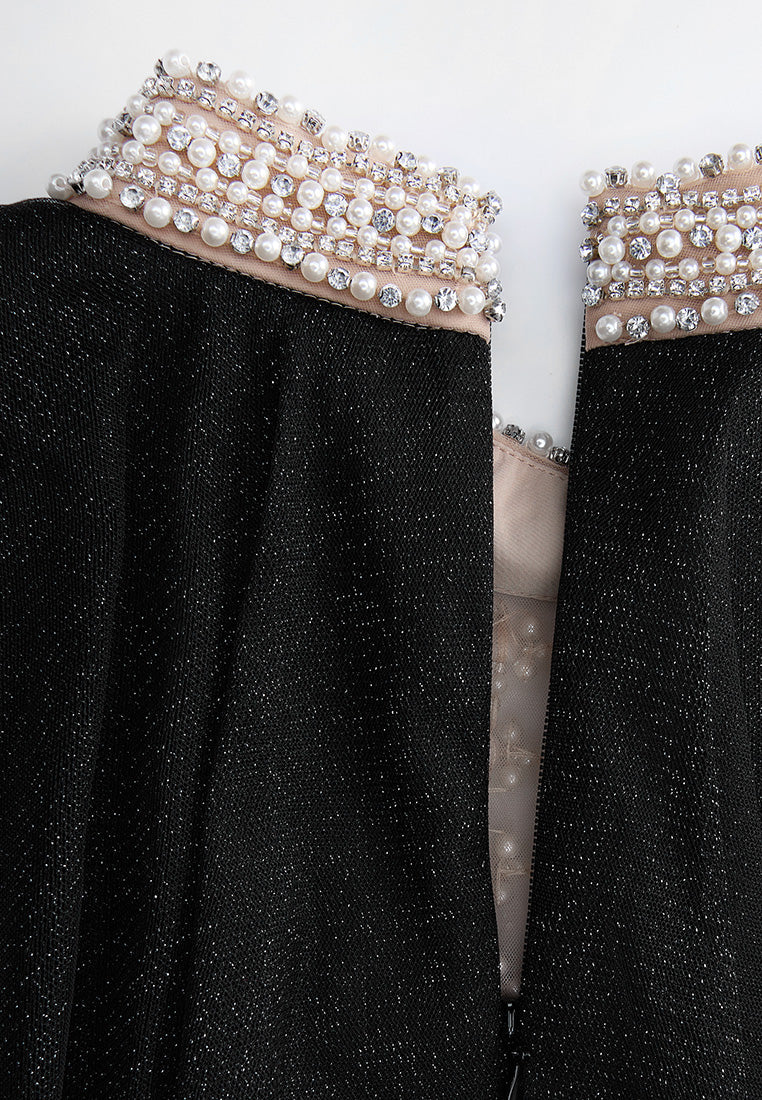 A luxurious gown, perfect for nighttime datings, cocktail parties and balls. A v-neck panel with patterned embellishment made with pearls and crystals. Black organza with interwoven lurex shimmers in every angle. Pleated detail below the bust. Cap sleeves.