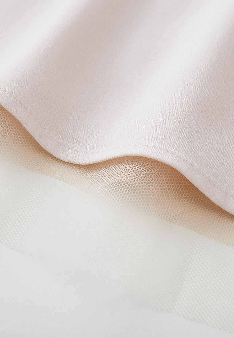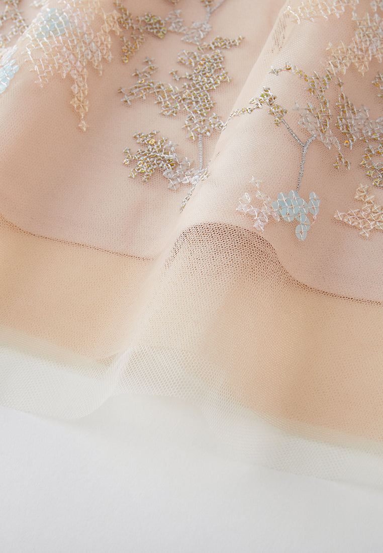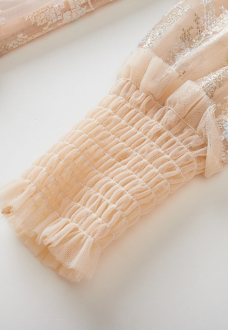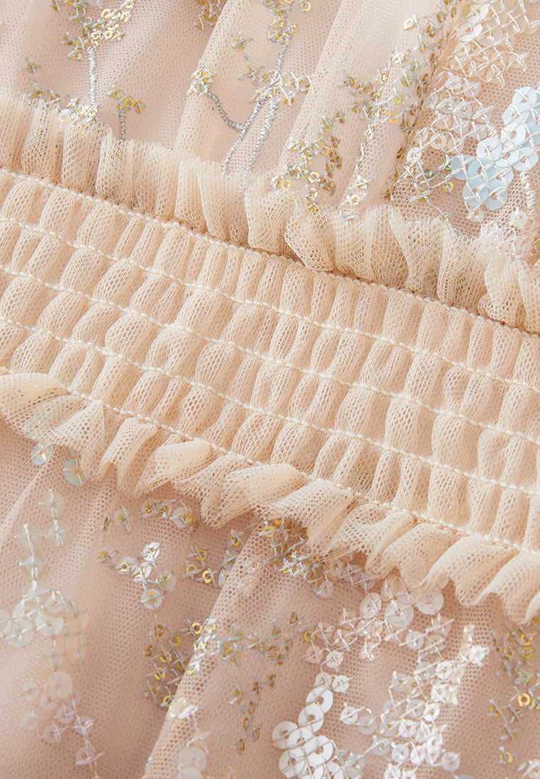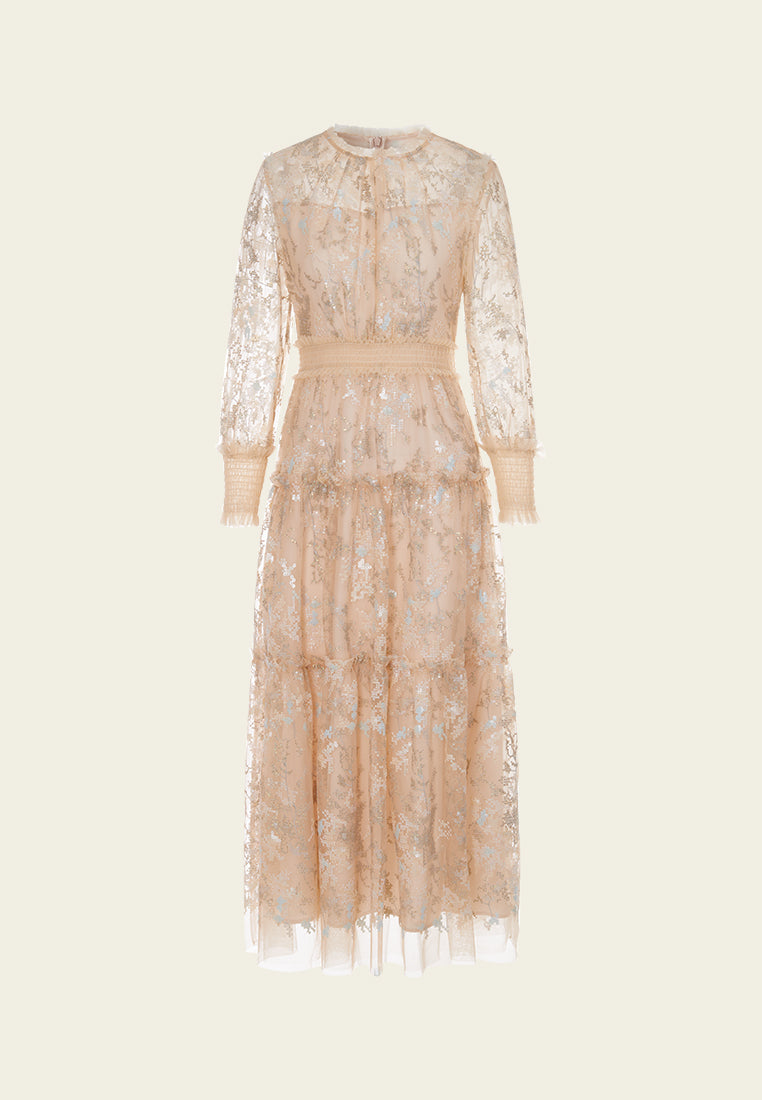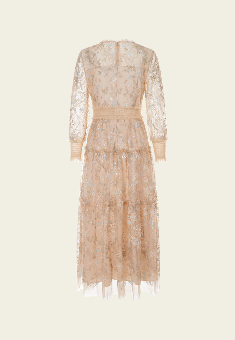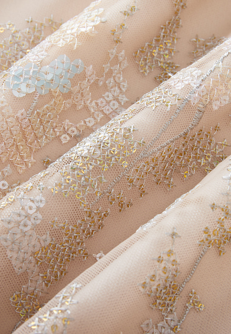 Lithe and graceful, put on this dress to make heads turn for your affable, feminine temperament. The translucent beige mesh dress evokes low-key sexiness. Ruffled trims highlighting collar, waistline, and cuffs. Overlayed with intricate sequin-interwoven cross-stitch pattern. Panelled. Embedded camisole. Ideal outfit for evening social occasions and cocktail parties.