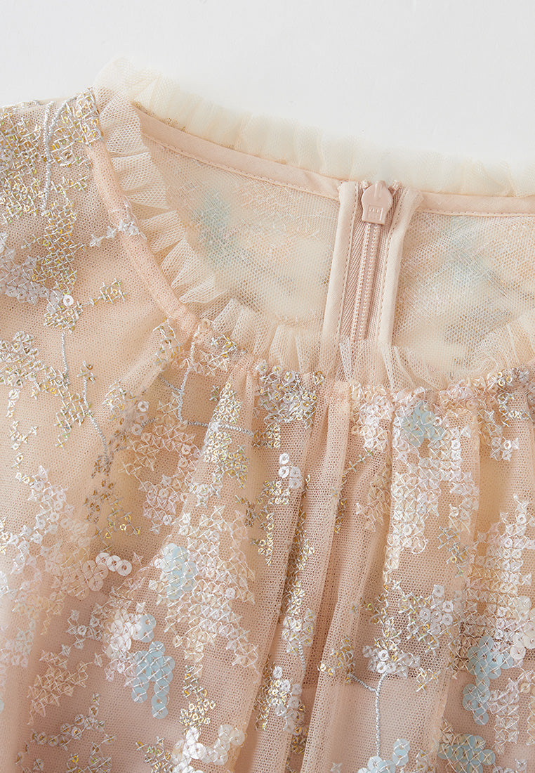 Ruffled-trim Cross-stitch Detail Sequin-detail Mesh Dress