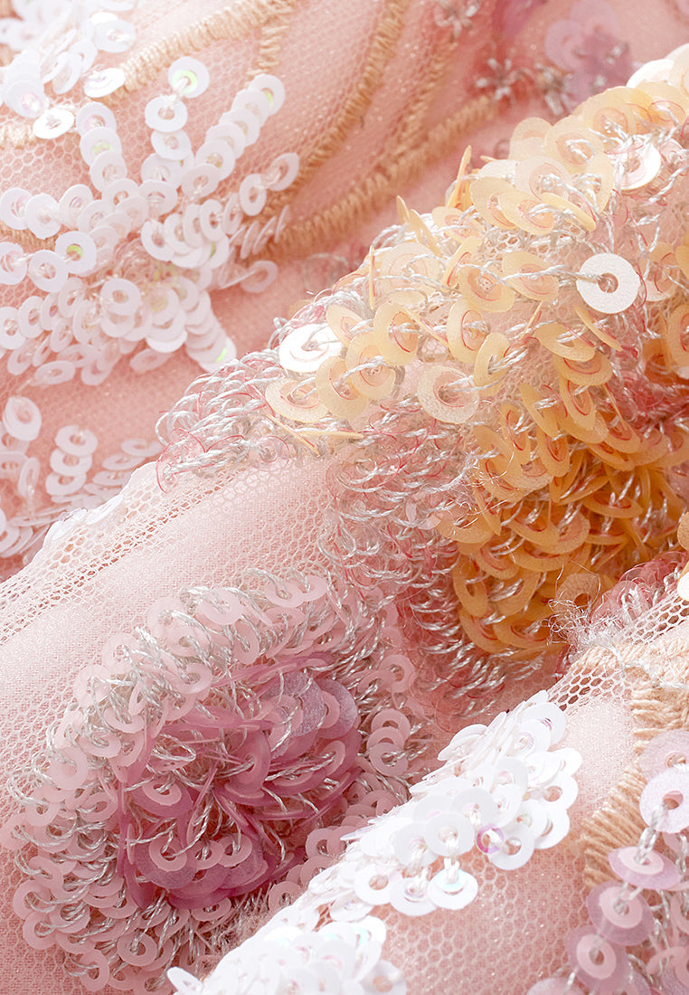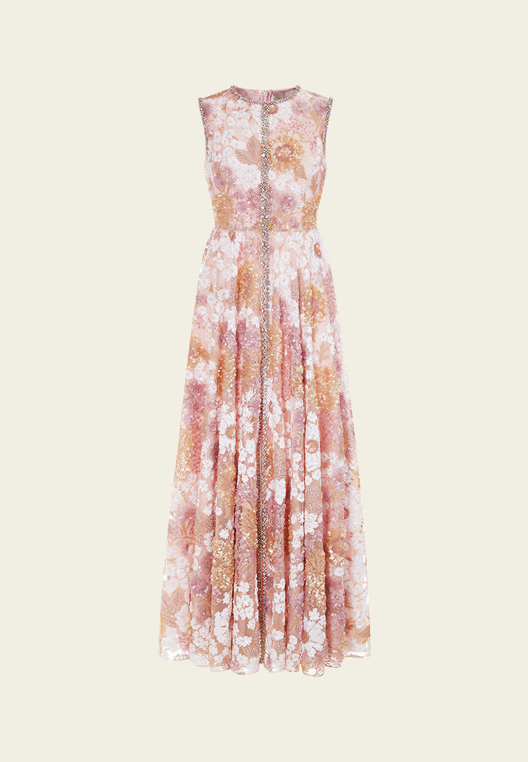 Glamorous and evoking a delightful feminine feeling, this sleeveless mesh dress is overlayed with abundant details of sequins on embroidery. Round up with an appealing row of flickering crystals from the collar through the hem, as well as the sleeveless edge.
