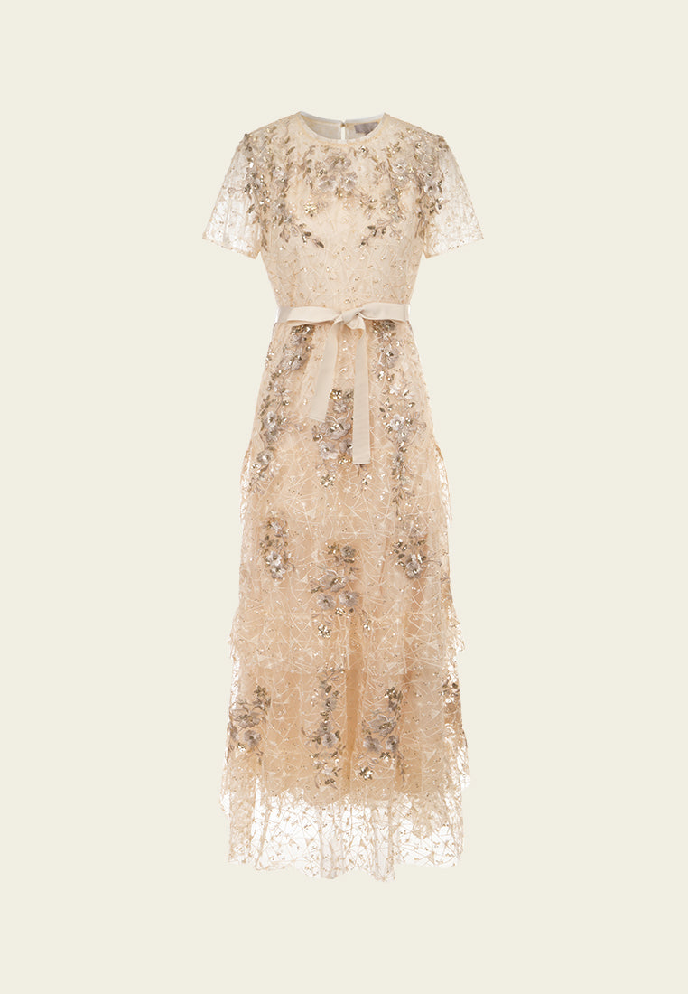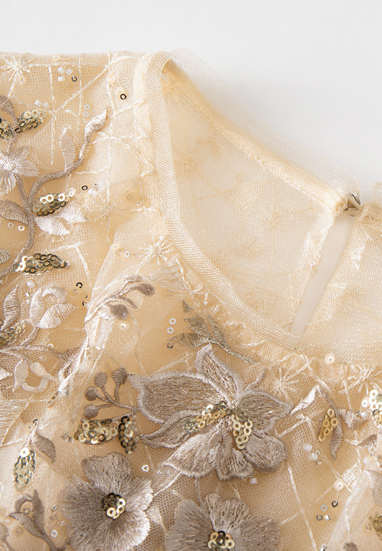 Sequin-detail Floral Embroidered Layered Mesh Dress