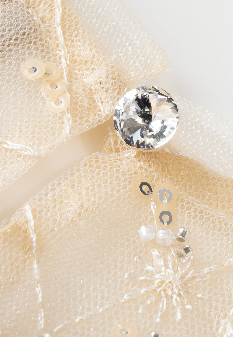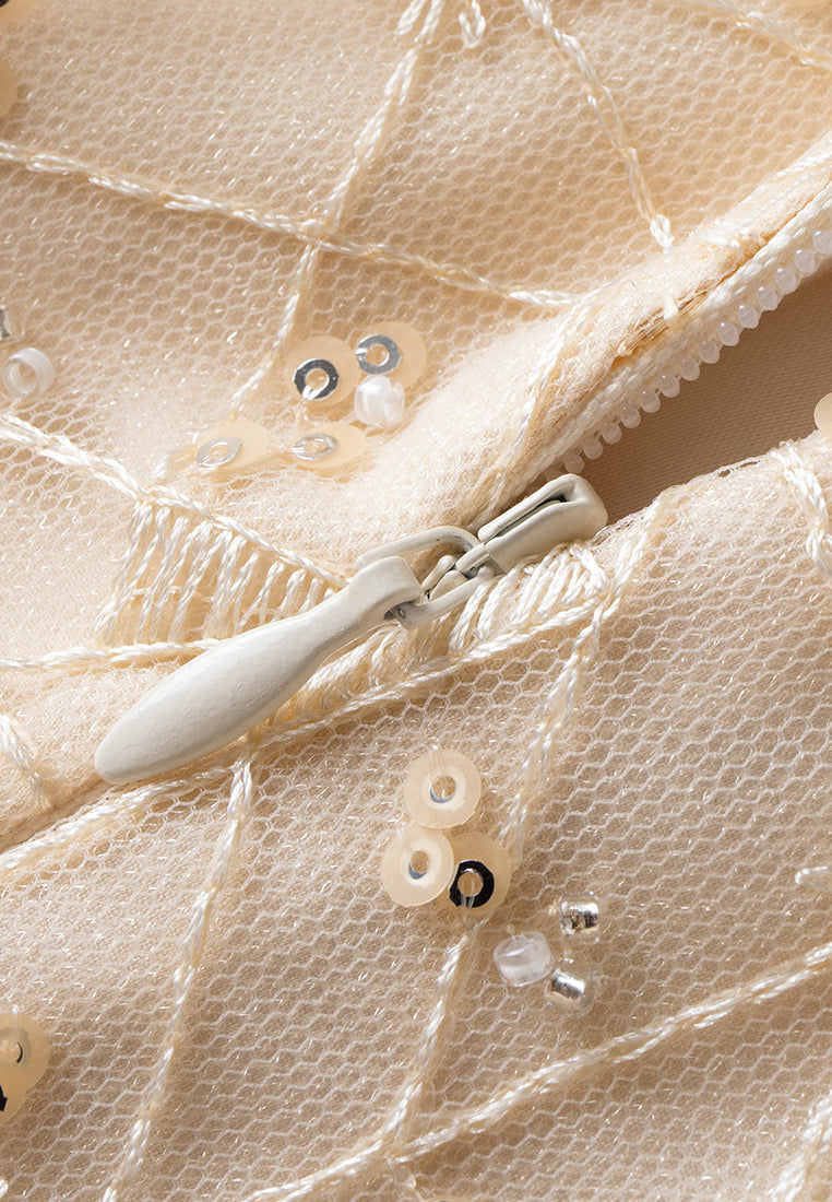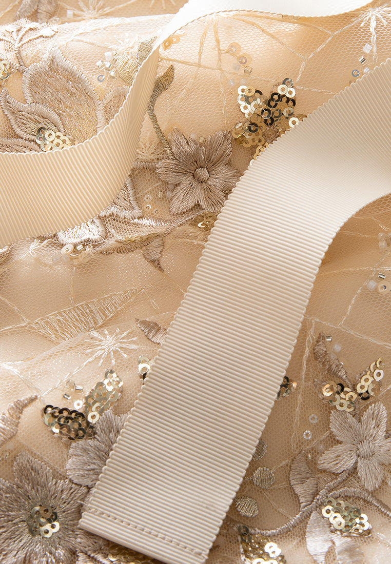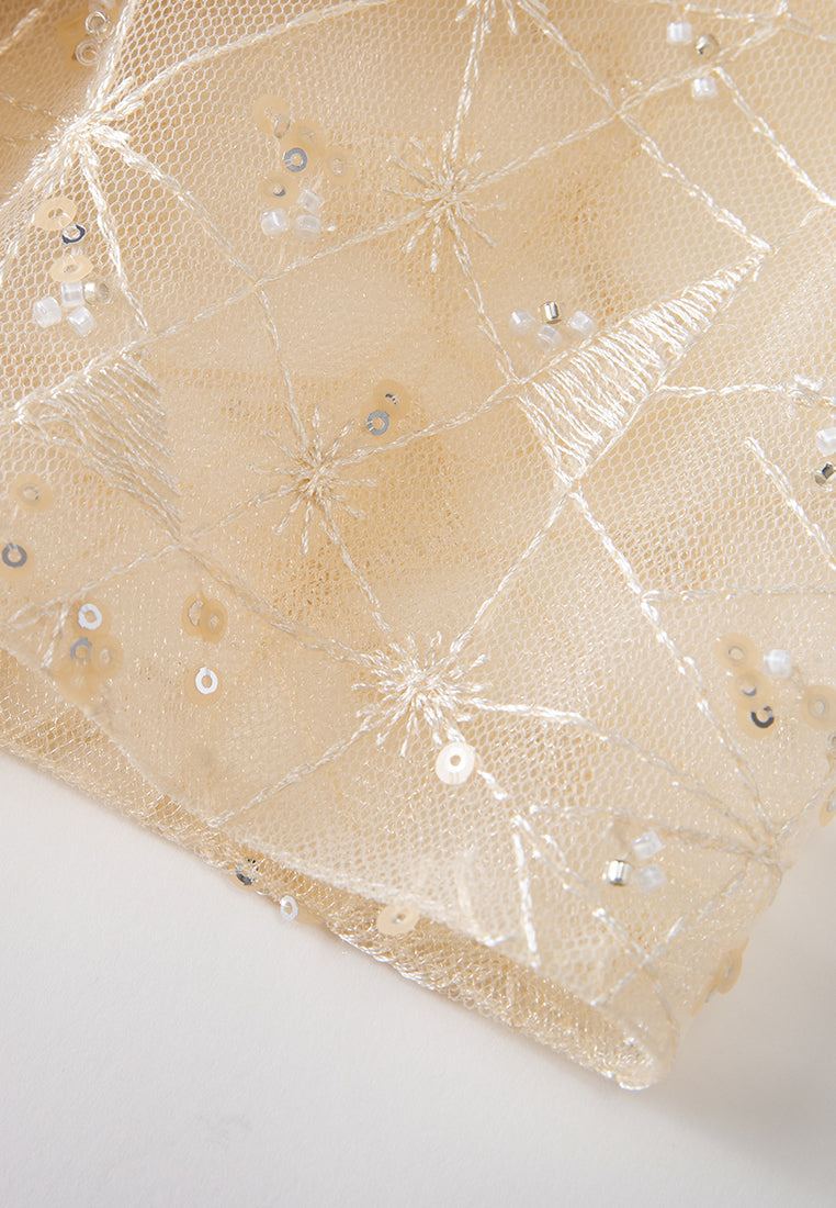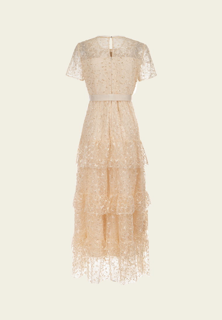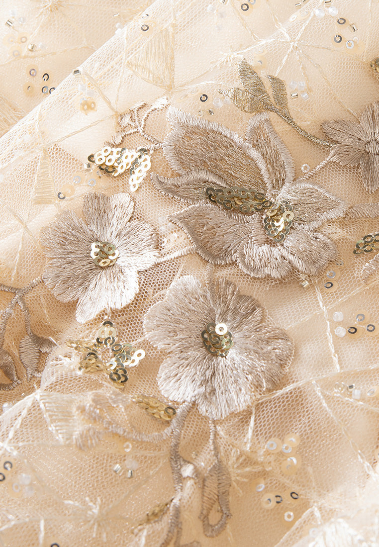 Elegant and sophisticated, this layered mesh dress is filled with opulent details, made for cultured ladies to showcase their status and character. Same tone bronze gold floral embroideries falls on beige mesh, embellished with sprinkling sequins. Layered. Round up with waist-accentuating tie-belt.