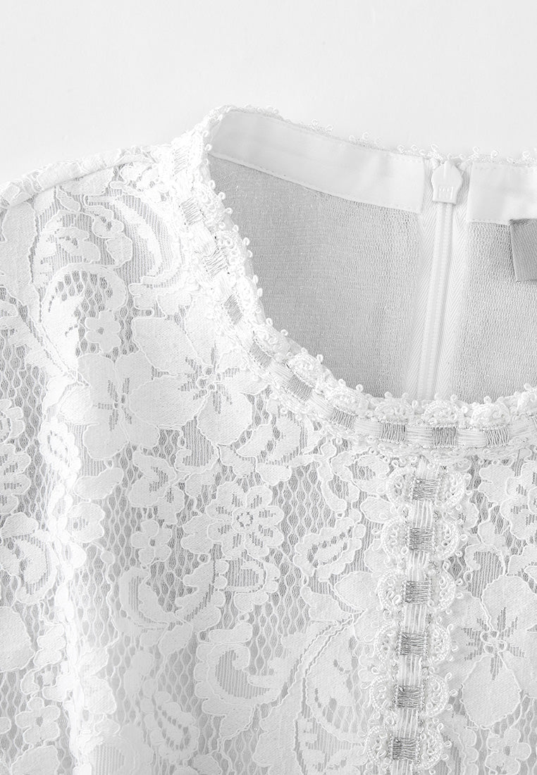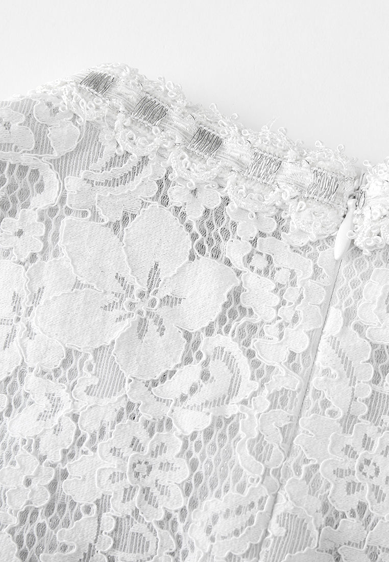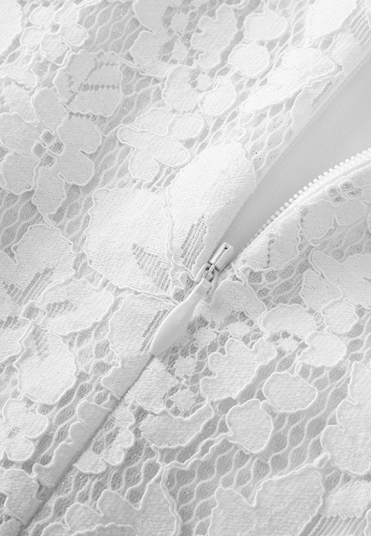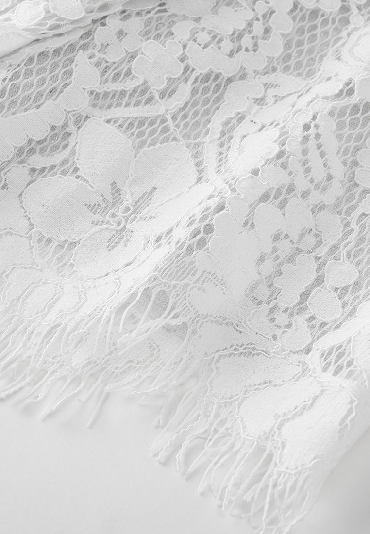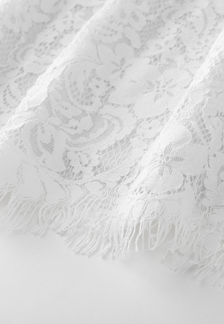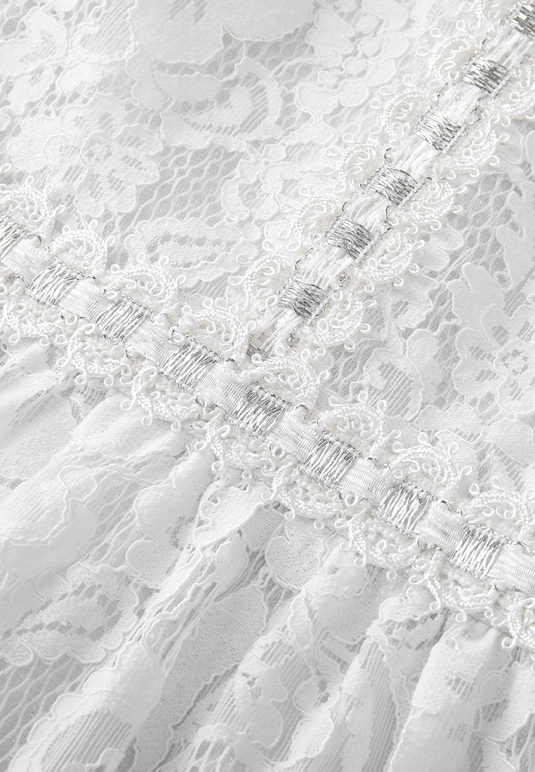 Ethereal and elegant, put on this dress to impress encounters with your feminine temperament. Delicate floral lace overlays in whole white colorway. Shimmering silver lurex interwoven, outlining the structure. Ruffled detail below the thighs. Finishing up with frayed detail draping from hems and sleeves.