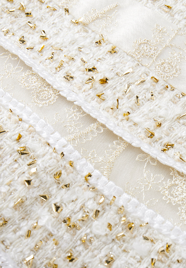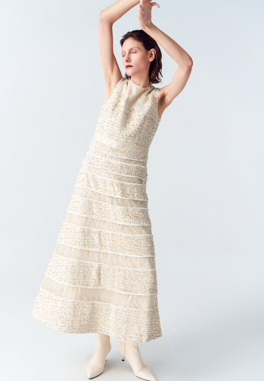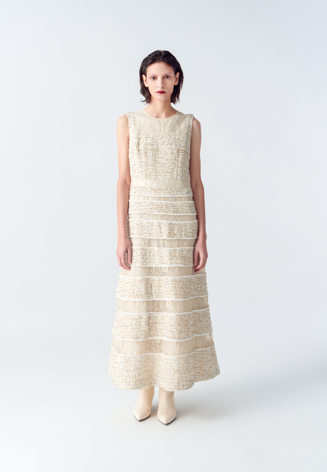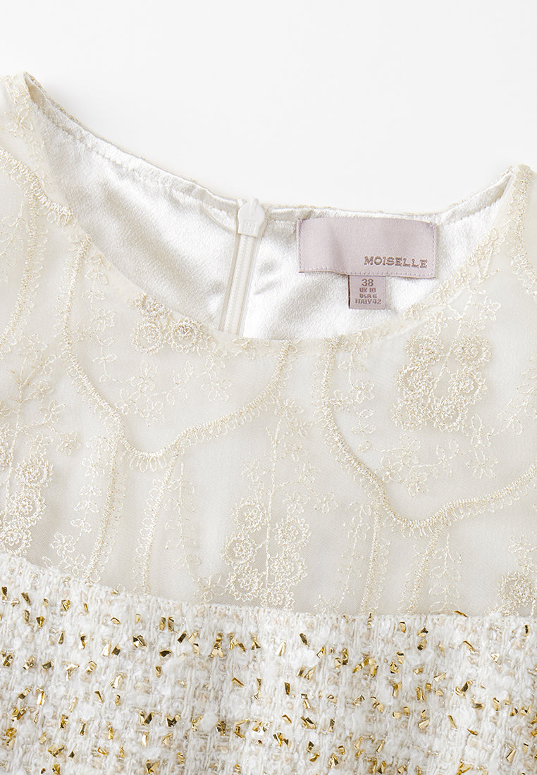 An airy dress for night gatherings, parties, and dinners. Tweed and lace are arranged alternatively, balancing out the visual proportion. Gold lurex delightfully decorating white tweed. The white and gold colorway evokes an ethereal feeling. Intricate white lace delightfully harmonizing with tweed.