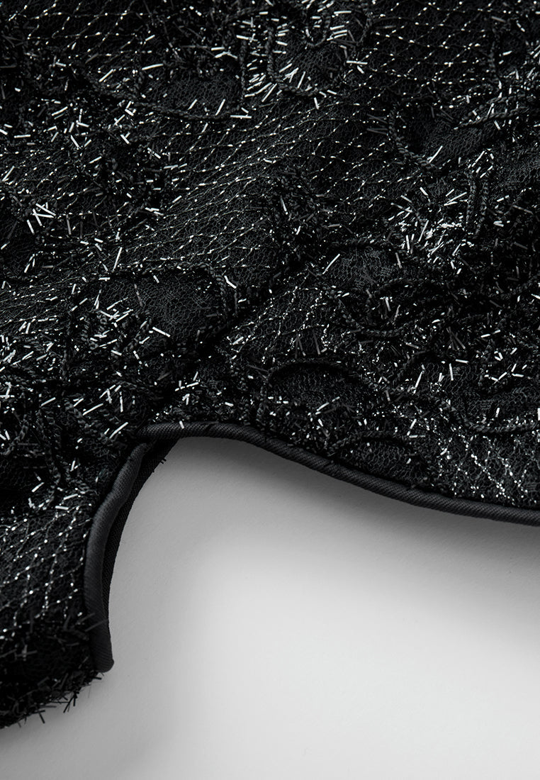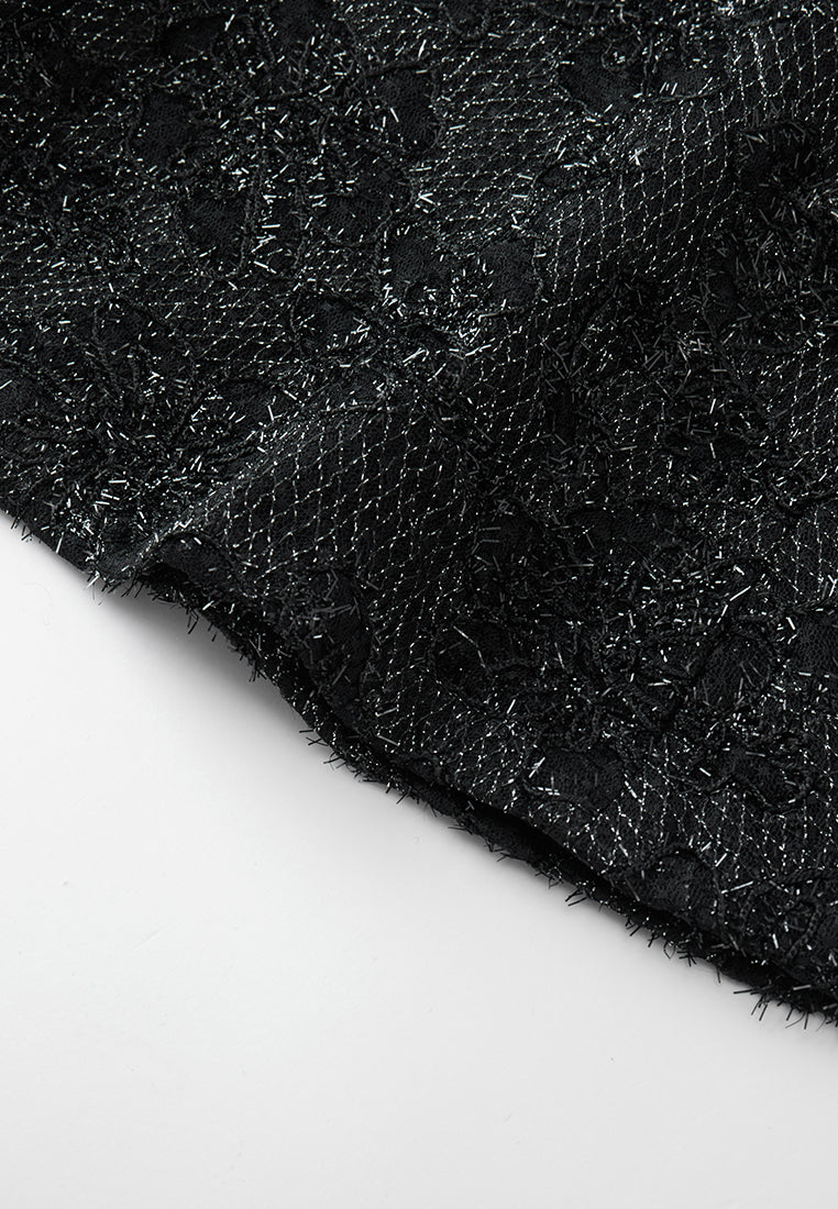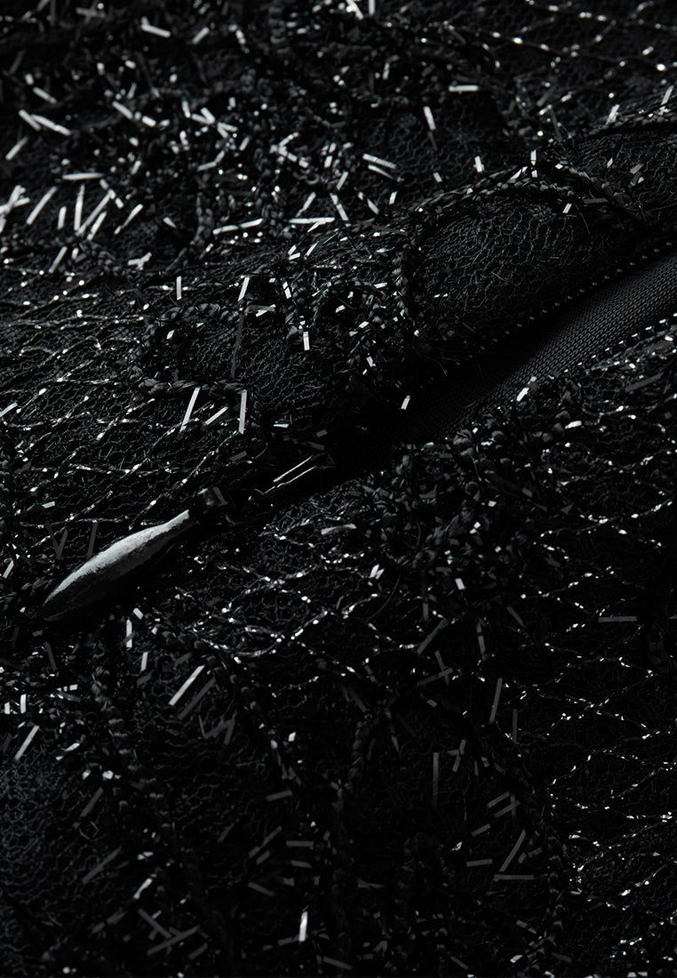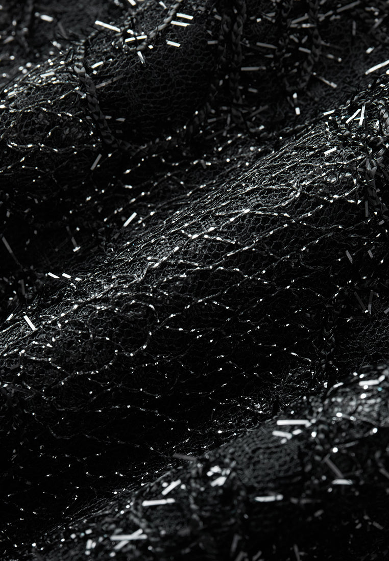 Cultured and prestige, making eyes stop on you in this dress that showcasing your status and taste. Hollow carved black lace overlays, with frayed silver lurex shimmers at every angle. Boasts an echoing v-neck embellishment interwoven with sliver lurex, crystals and sequins. Slim-fit.