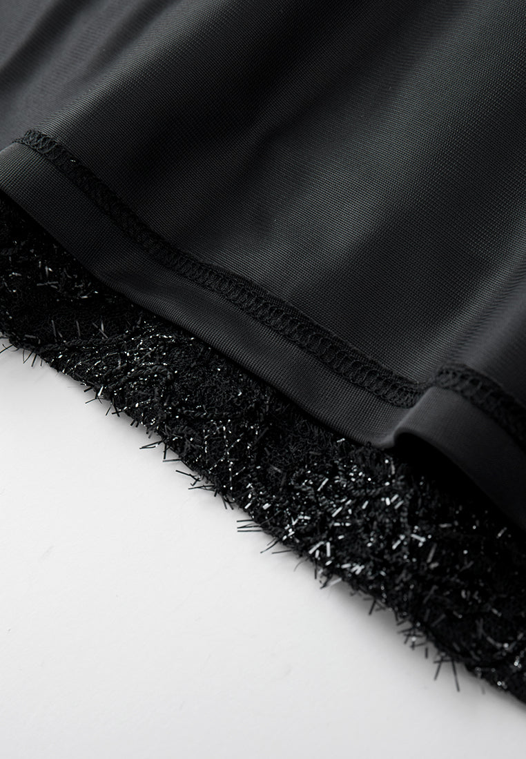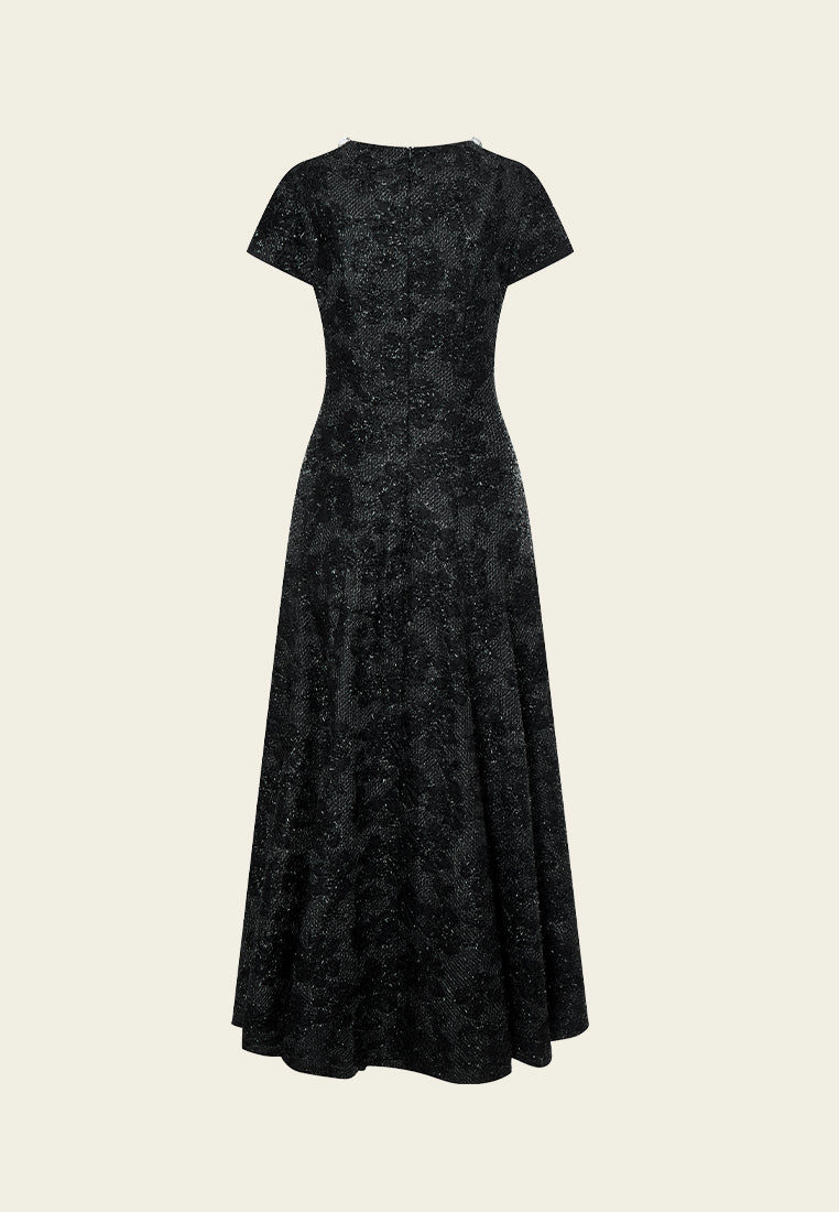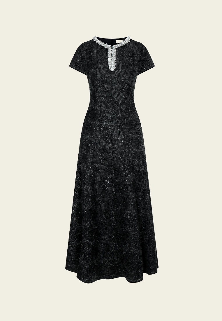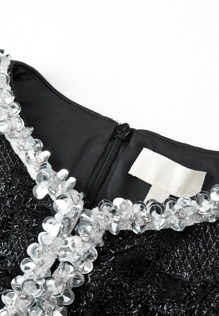 Cultured and prestige, making eyes stop on you in this dress that showcasing your status and taste. Hollow carved black lace overlays, with frayed silver lurex shimmers at every angle. Boasts an echoing v-neck embellishment interwoven with sliver lurex, crystals and sequins. Slim-fit.